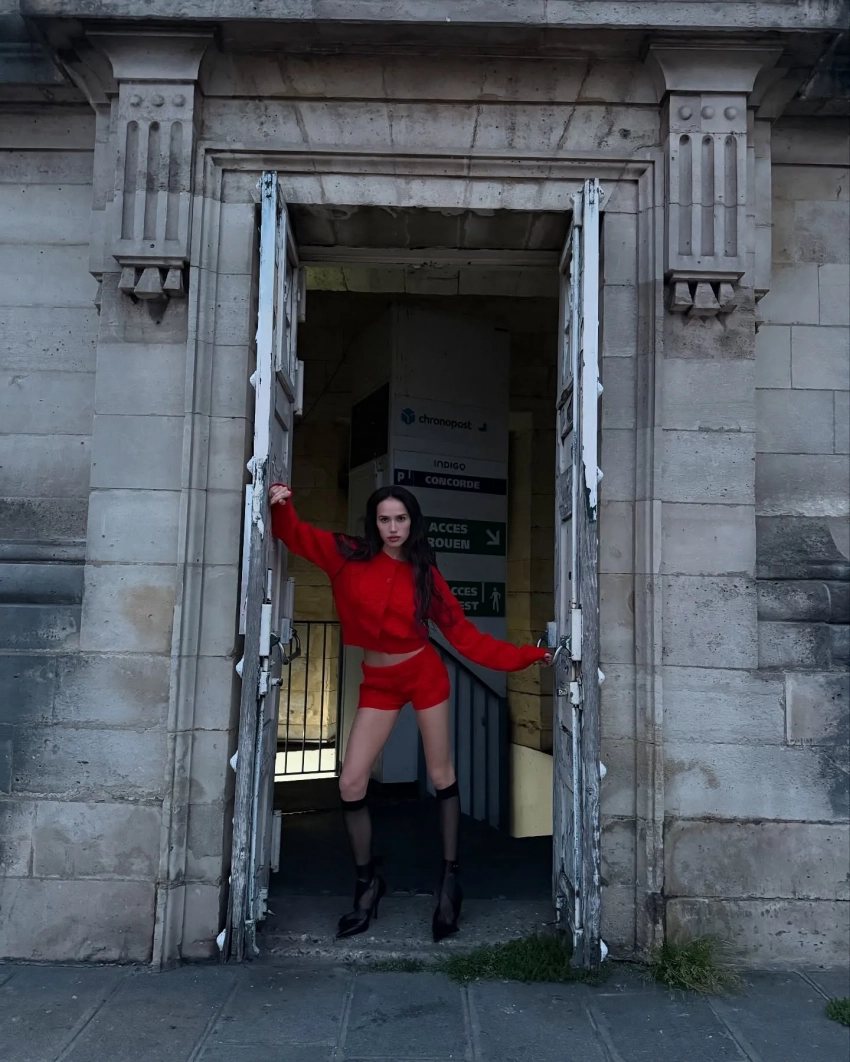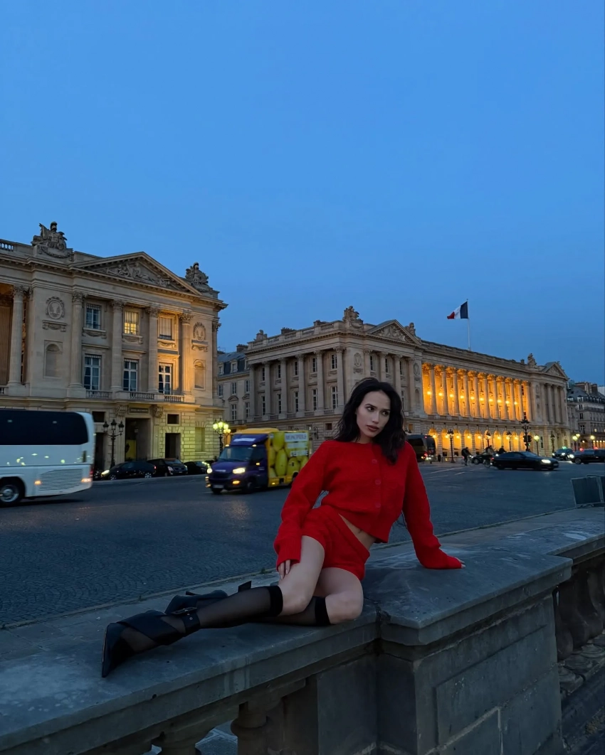 На новых снимках Алина позирует на улицах Парижа в красном жакете и микрошортах в тон. Образ она дополнила чёрными чулками и такого же цвета туфлями.