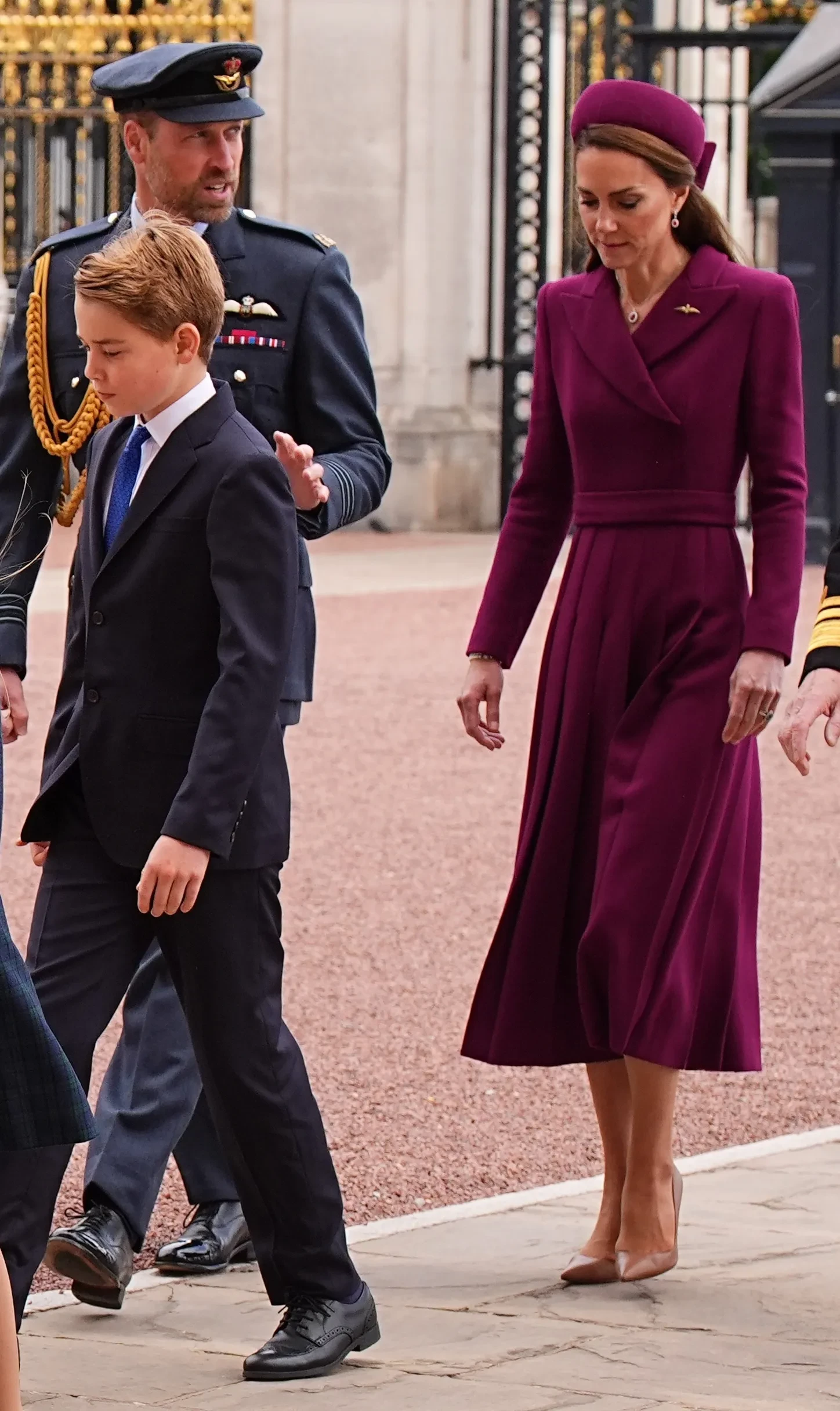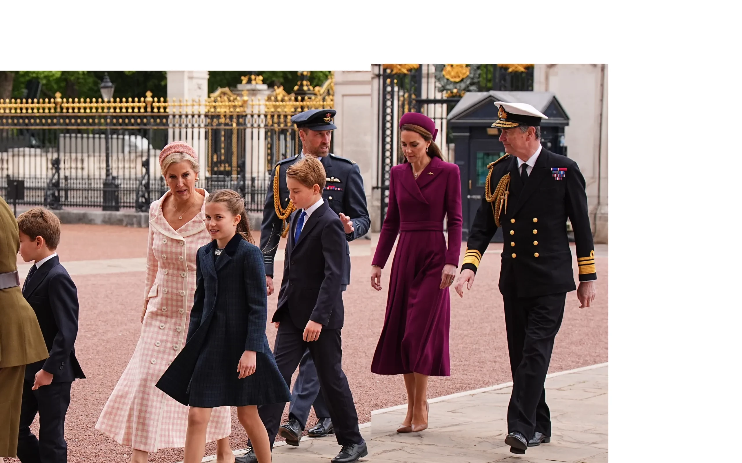 43-летняя принцесса Уэльская появилась перед публикой у мемориала королевы Виктории возле Букингемского дворца в фиолетовом платье-пальто и шляпке-фасинаторе в тон. 42-летний принц Уильям был в военной форме, на 11-летнем Джордже, 10-летней Шарлотте и семилетнем Луи были строгие тёмно-синие наряды.