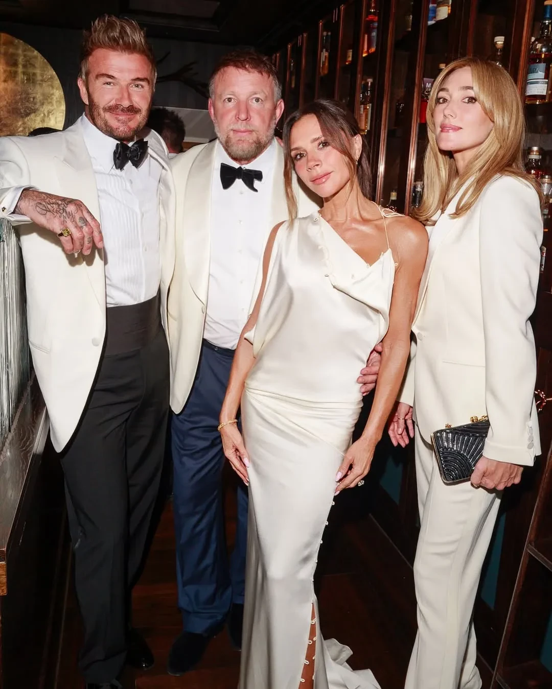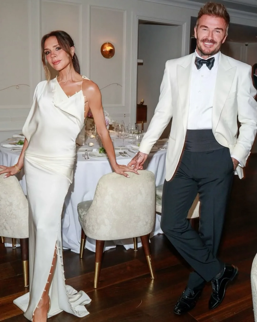 На кадрах футболист позирует в белом смокинге вместе с женой и младшими детьми: 22-летним Ромео, 20-летним Крузом и 13-летней Харпер, а также танцует и веселится с друзьями. Виктория для вечера выбрала белое асимметричное платье, а Харпер надела красное платье-комбинацию.