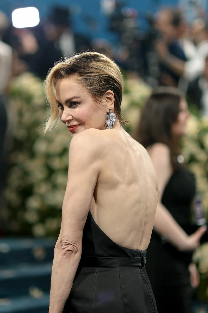Николь появилась перед фотографами в чёрном тотал-луке Monse и вновь с длинными волосами. Ранее актриса пришла на Met Gala в необычном для себя образе — с короткой прической пикси.