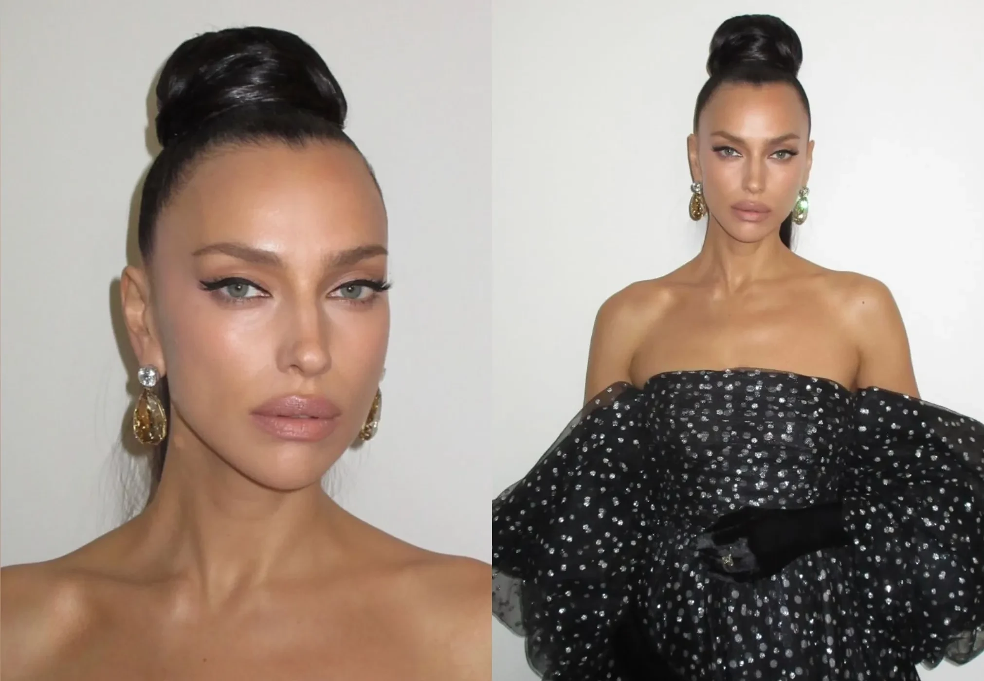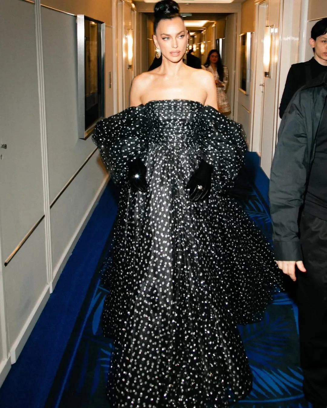 39-летняя российская супермодель вышла на красную дорожку в пышном платье в горох Armani Privé. Её образ дополнили украшения Anita Diamonds: серьги с бриллиантами грушевидной формы весом 60 каратов каждая и два кольца с 15-каратными бриллиантами, а также чёрные перчатки и высокая причёска. "Какая волшебная ночь в Каннах. Спасибо", — написала Ирина в соцсетях.