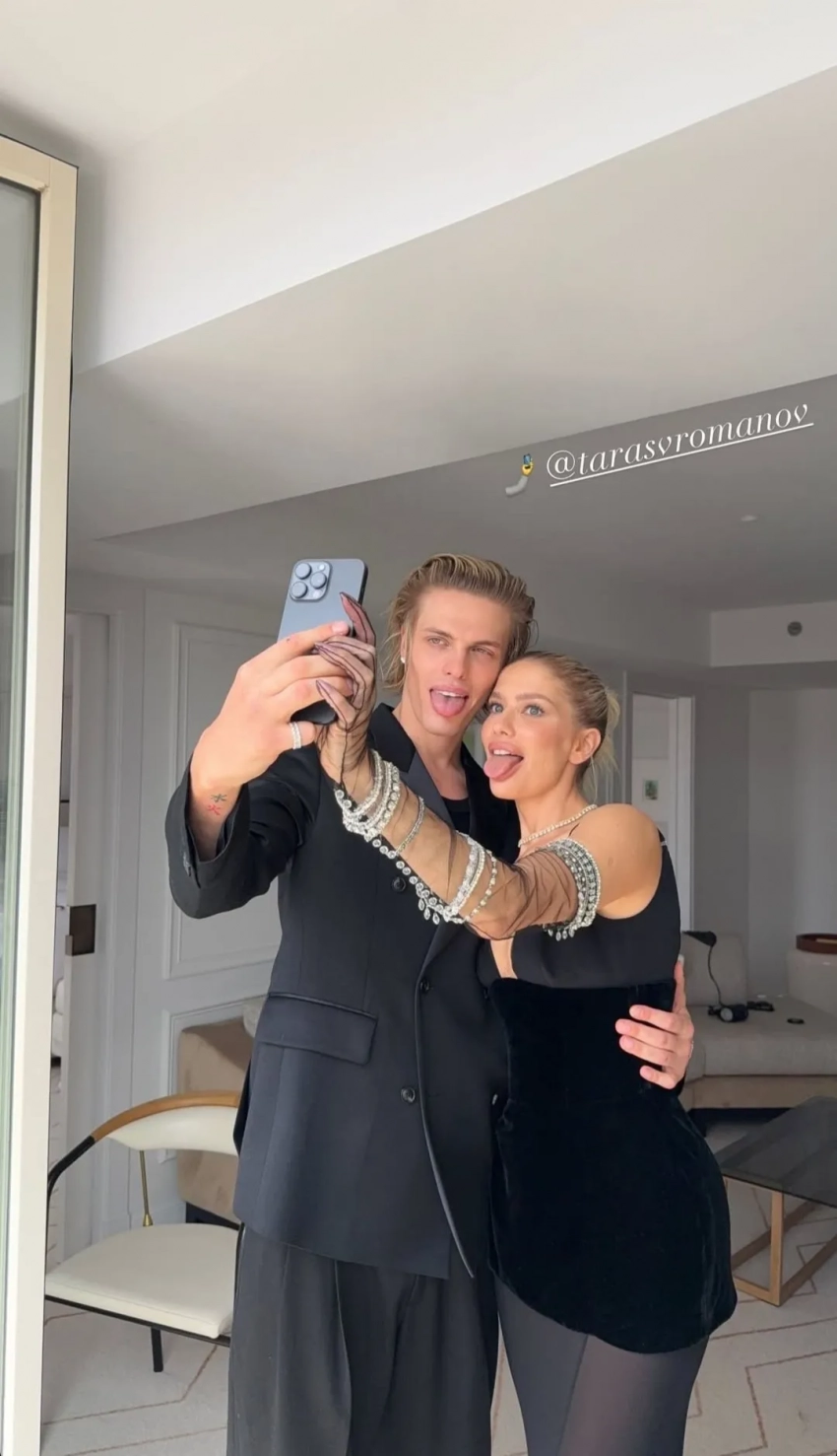 Для выхода в свет модель выбрала черное платье в пол Ulyana Sergeenko. Тарас также был в черном. Он держал возлюбленную за руку, помогая ей подняться по лестнице. Примечательно, что многие журналисты перепутали Романова с актером Мэттью Греем Гублером и подписали фотографии с ним чужим именем.