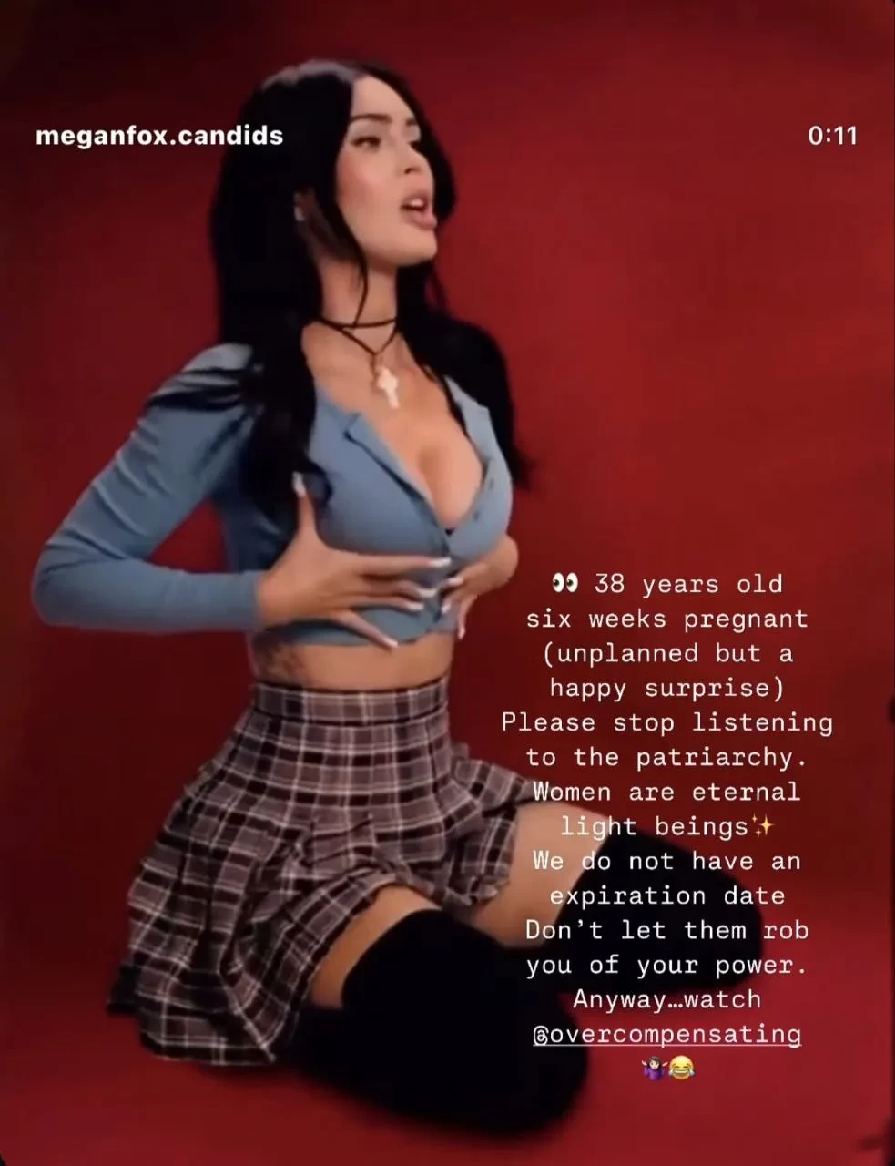 Фокс выложила в сторис* видео со съёмок нового сериала "Сверхкомпенсация" со своим участием, в котором предстала в топе с глубоким декольте и короткой юбке. В комментарии к ролику она заявила, что видео было снято, когда она была на шестой неделе беременности, и назвала её "незапланированным, но приятным сюрпризом". Она также высказалась о женской сущности.