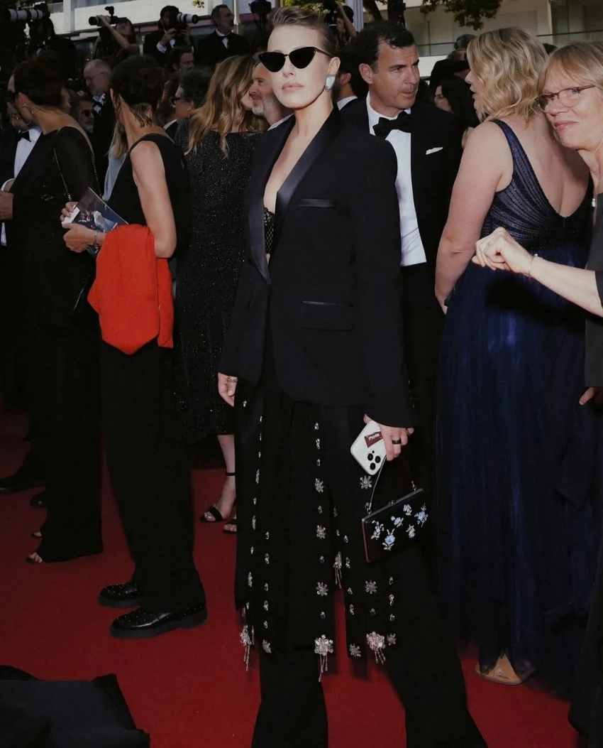 В этот раз на красную дорожку журналистка вышла в костюме LIVY и юбке Prada. Ее образ дополняли серьги Valentino, туфли Ferragamo и сумка Prada.
