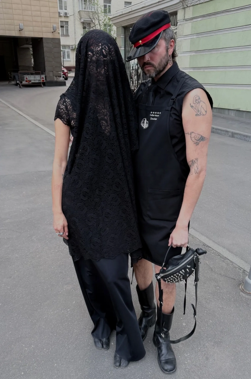 Софья Эрнст, Ксения СобчакДресс-код для гостей был total black, но соблюсти его решили не все. Софья Эрнст пришла в белом свадебном платье и розовых колготках, отметив, что когда она выходила замуж за Константина Эрнста, у них была только регистрация в ЗАГСе, без платья, поэтому она решила "забрать своё". Ксения Собчак тоже пришла в белом прозрачном платье в горошек, а Гоша Рубчинский позировал с гостями в серой футболке и с рюкзаком. Валерия Гай Германика надела золотое платье с рюшами, а Ксения Шипилова — серый брючный костюм.