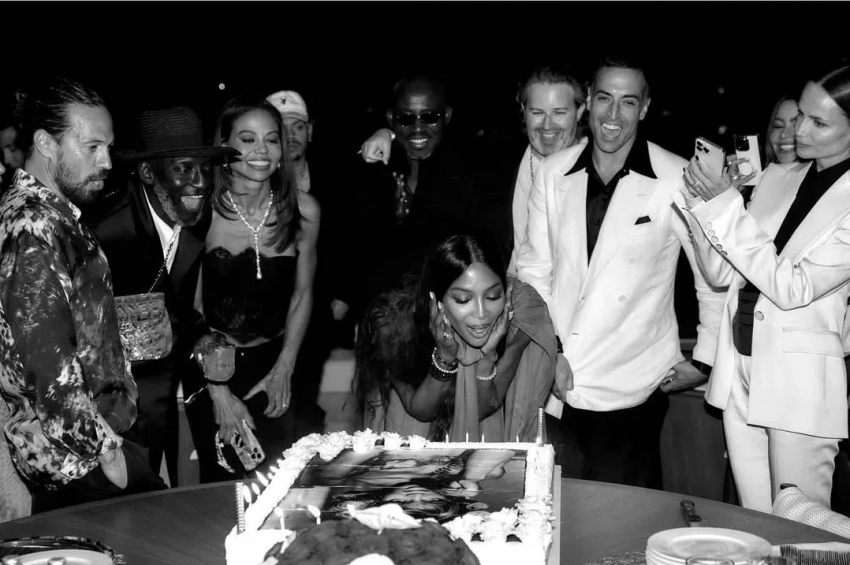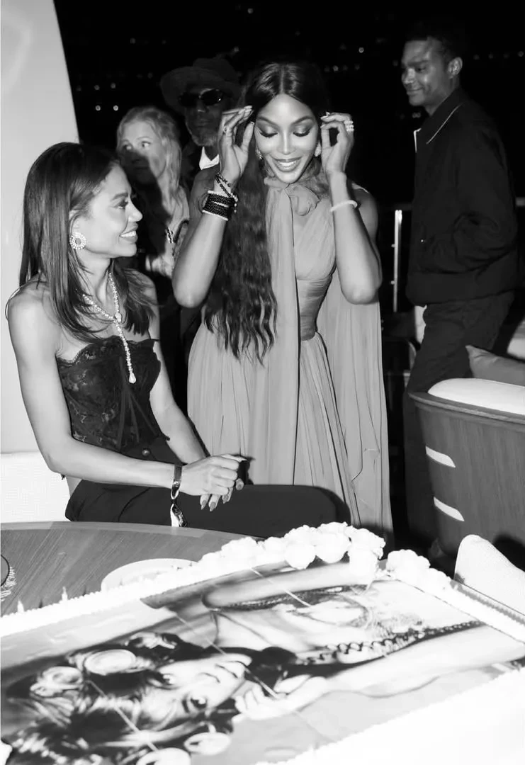 Судя по фото, у Кэмпбелл было две вечеринки. На одной она появилась бирюзовом платье Dolce & Gabbana, среди гостей были София Вергара, Эдриан Броуди и сын Арнольда Шварценеггера — звезда "Белого лотоса" Патрик Шварценеггер. Рядом с именинницей также находился мультимиллионер из Саудовской Аравии Мохаммед Аль Турки, с которым ей приписывают отношения. Торт для Наоми украсила её культовая фотография для Interview Magazine 1991 года.