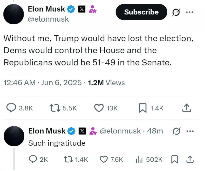 Владелец Tesla не остался в долгу и отметил в соцсети X, что без его помощи Трамп вообще не стал бы президентом: "Без меня Трамп проиграл бы выборы, демократы контролировали бы Палату представителей, а республиканцы имели бы 51–49 в Сенате. Какая неблагодарность".