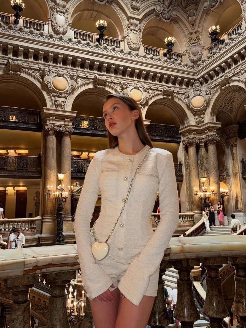 На снимках Пересильд позирует в белом твидовом комбинезоне на фоне зала. "Завораживающая красота", — написала звезда сериала "Слово пацана" на французском языке.