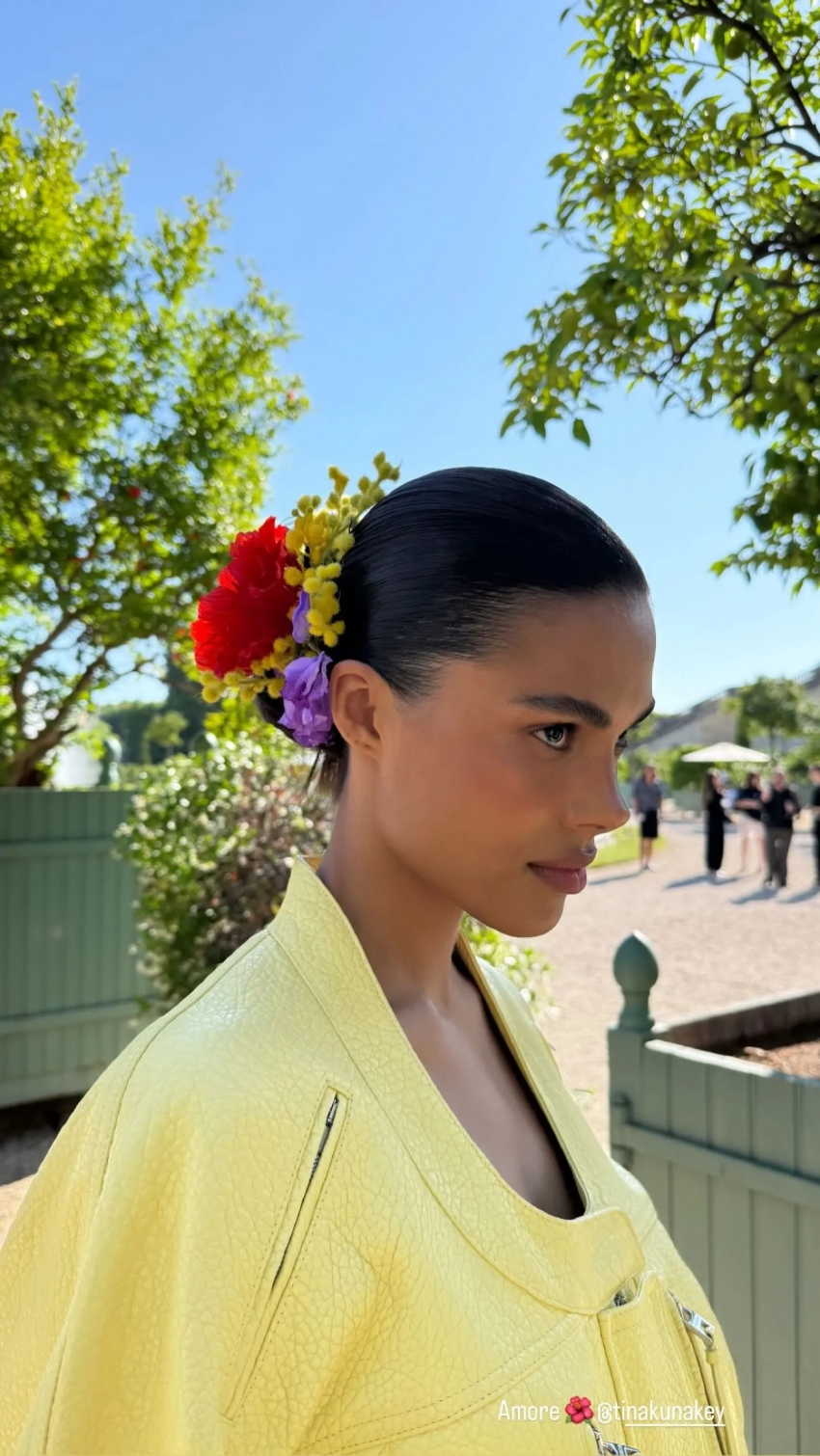 Тина Кунаки (слева) с подругами на показе Jacquemus