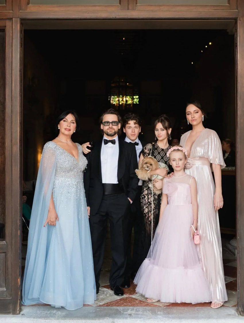 Ирина и Борис Зарьковы с детьми, Дина с женихом и сыномДинаСвадьба Дины и ДанаНевеста с отцомВ Венецию специально прилетели шеф-повара альянса Бориса Зарькова White Rabbit Family (WRF). Для праздника, как рассказала Ирина Зарькова, заказали 46 килограммов икры, тысячи живых цветов, четыре автобуса шаманского из Франции и организовали лодки для 170 гостей, а платье невесты от Georges Hobeika шили почти год.
