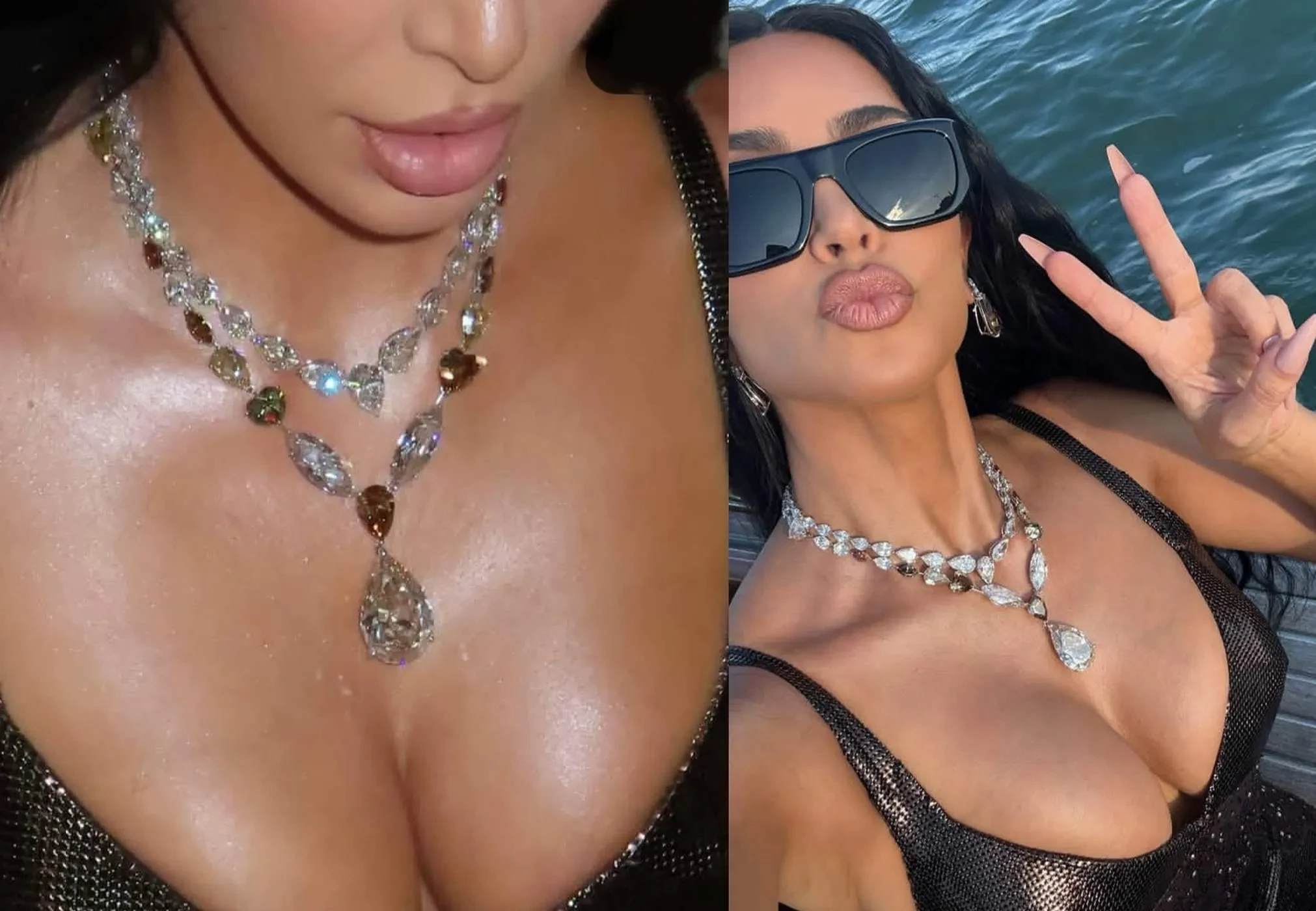 На днях 44-летняя Ким Кардашьян опубликовала в соцсетях фотографии со свадьбы Лорен Санчес и миллиардера Джеффа Безоса, где она была одной из приглашённых. Поклонников звезды особенно заинтересовали украшения на её шее.