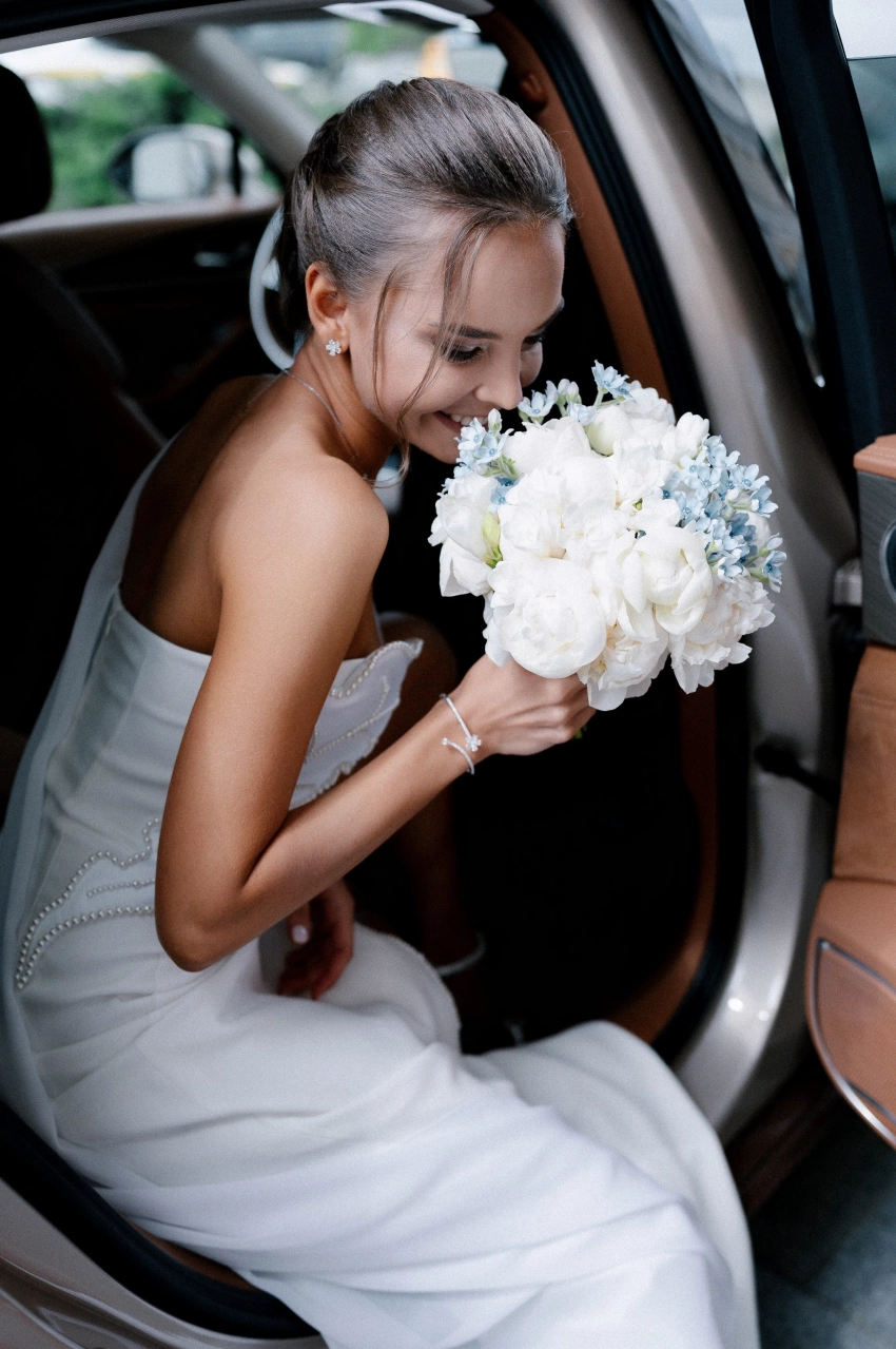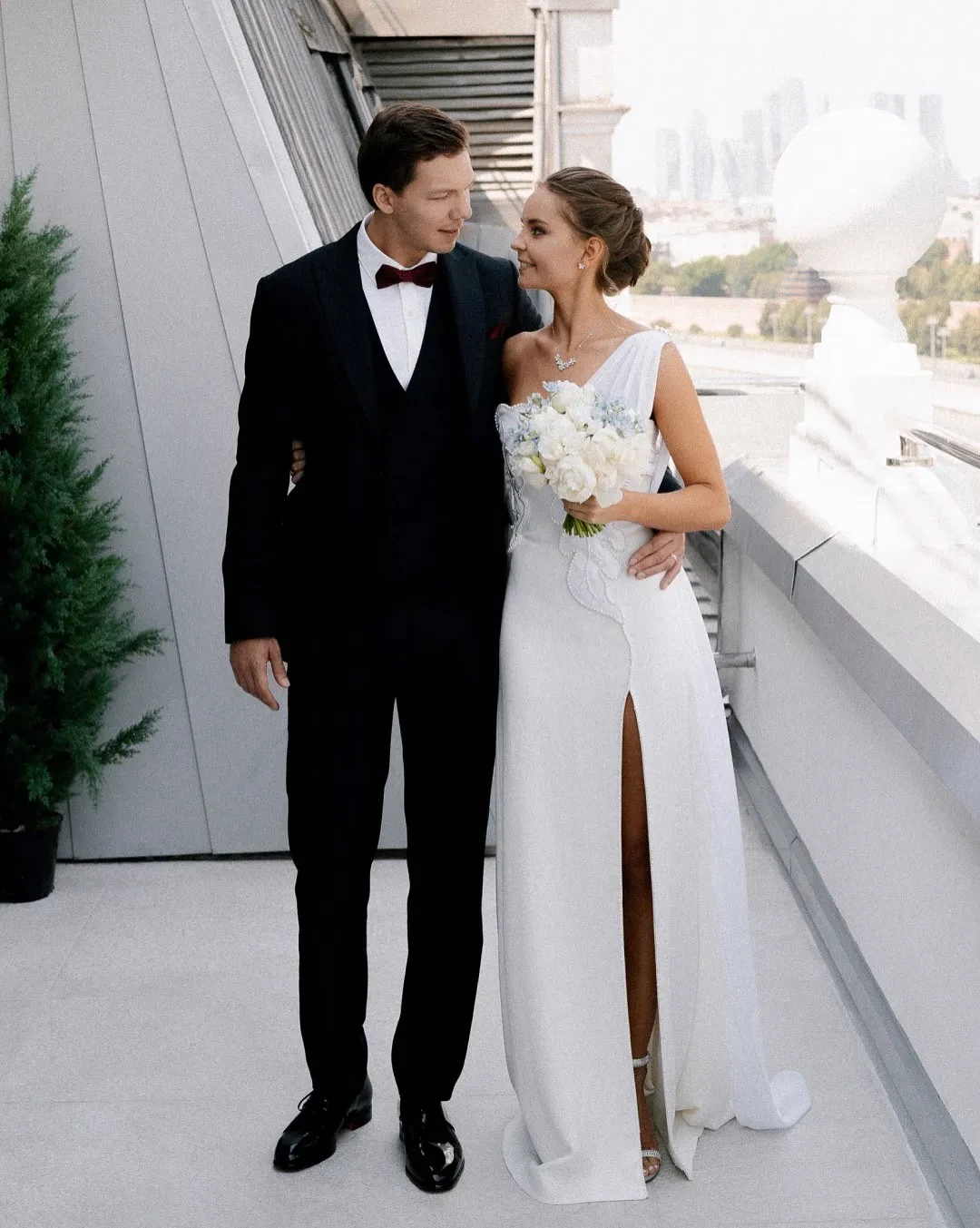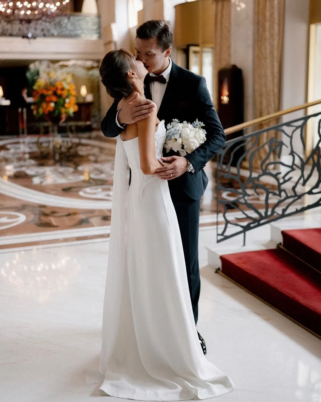 Сегодня в сети появились новые снимки со свадебной фотосессии и из ЗАГСа: фотосессия молодожёнов прошла в отеле "Балчуг Кемпински". На снимках невеста позирует в платье с разрезом бренда "Хохлома x Алёна Ахмадуллина" и в украшениях Mercury.