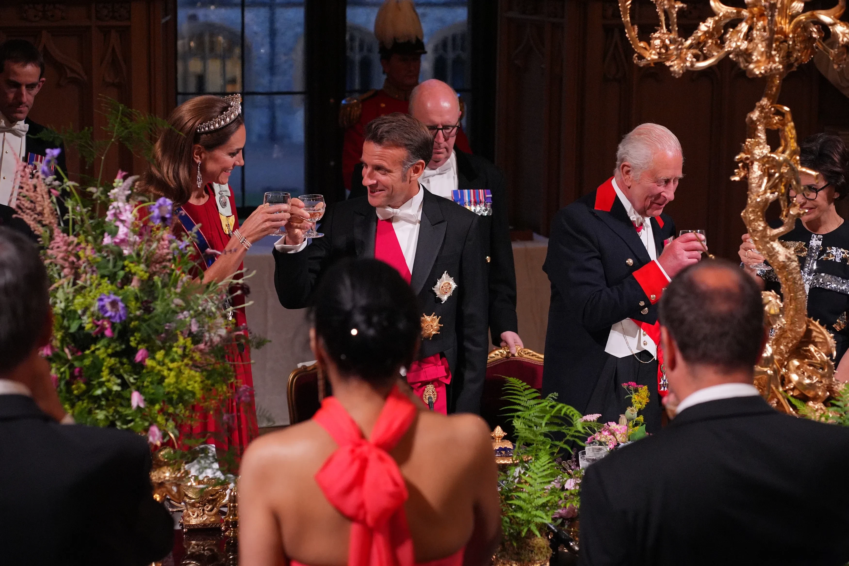 Кейт Миддлтон и принц Уильям, король Карл III и королева Камилла на государственном банкете в честь визита Эммануэля Макрона