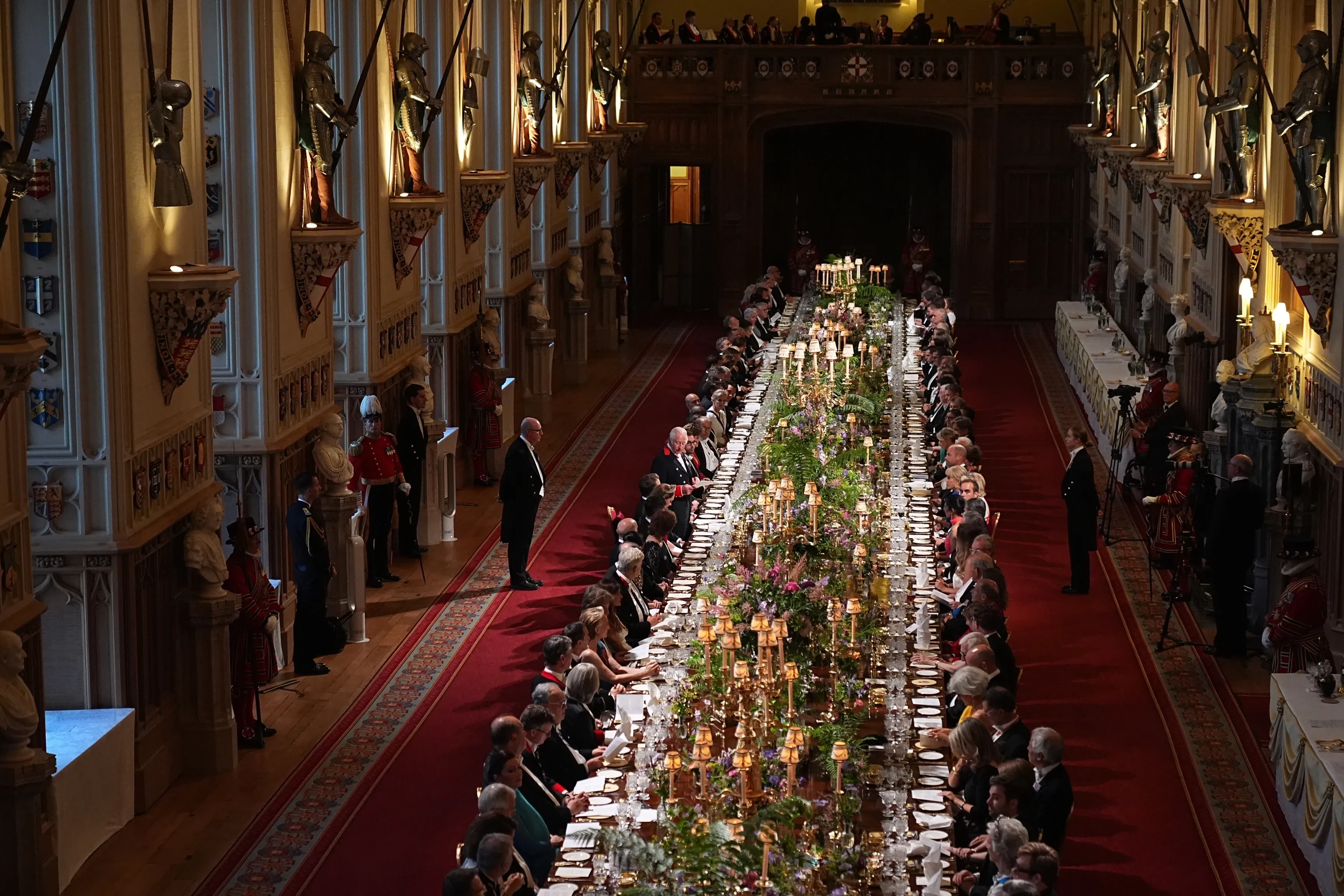 Сегодняшний банкет проходит в зале Святого Георгия. Столы украсили сезонными цветами из садов Букингемского дворца, Виндзора и Сэвилла. Гостям подали летние овощи с шалфеем, курицу сюприм со спаржей и кремом из эстрагона, на десерт — парфе из чёрной смородины с бисквитом и желе из бузины. Напитками вечера выступили вина Domaine Evremond, Corton-Charlemagne, Chateau Haut-Brion, Louis Roederer и английское игристое для тостов, а качестве "комплимента" подали коктейль "Соглашение" на британском джине, французском пастисе и лимонном курде с лепестками васильков и роз. После ужина гостей угощали портвейном Taylor’s 1977 года и коньяком Frapin 1948 года в честь годов рождения Макрона и Карла III. В завершении вечера состоялся концерт Валлийского национального оркестра BBC в Музыкальной комнате.