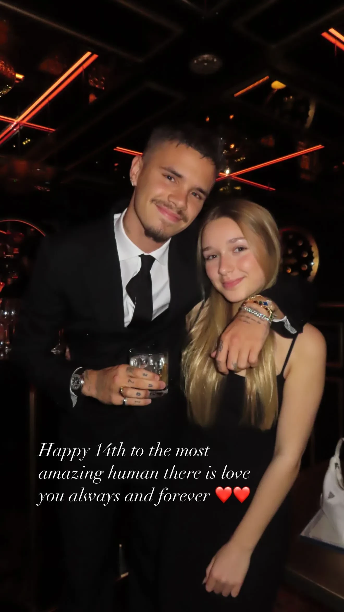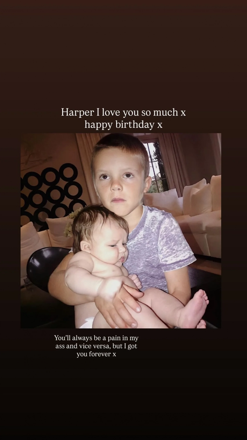 Бруклин Бекхэм, Харпер и Никола ПельтцРомео и Харпер БекхэмКруз и Харпер БекхэмРанее стало известно, что Бруклин Бекхэм пропустит день рождения младшей сестры из-за конфликта с родителями. Источники также сообщили, что Харпер всегда была близка с братом, поэтому его отсутствие станет для неё "настоящим ударом".