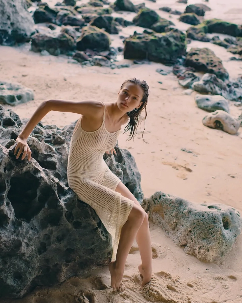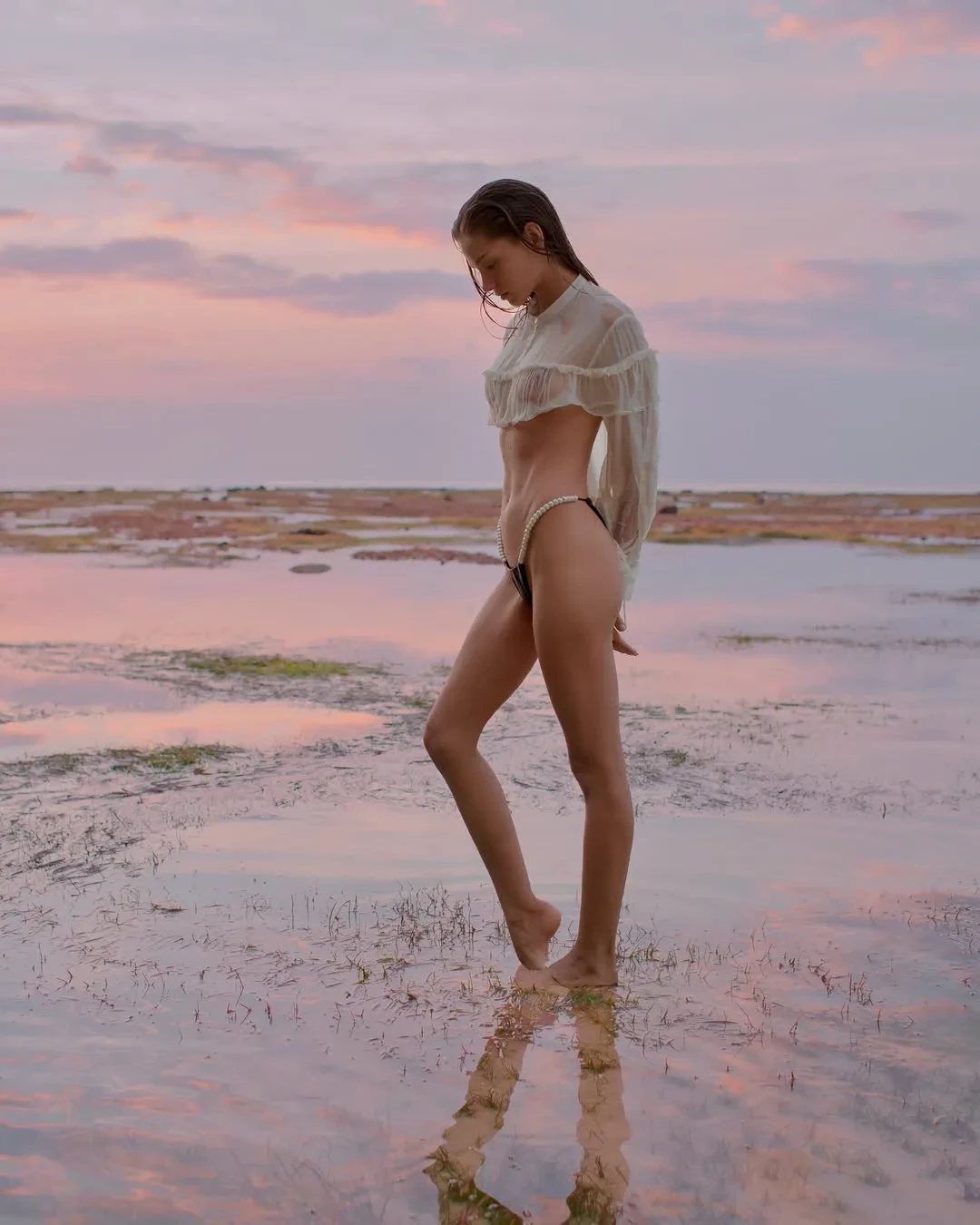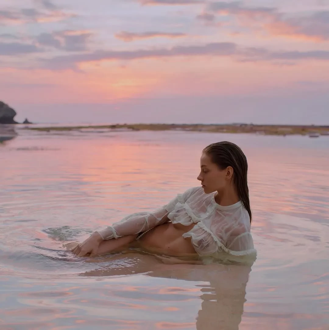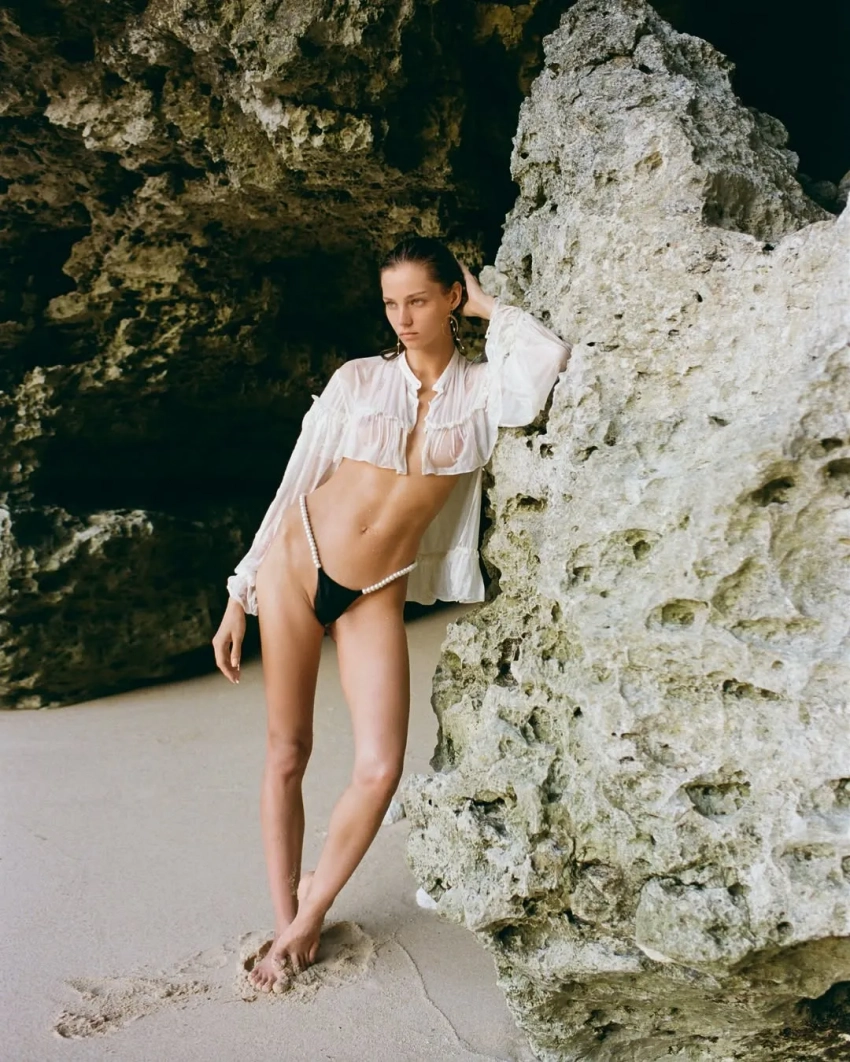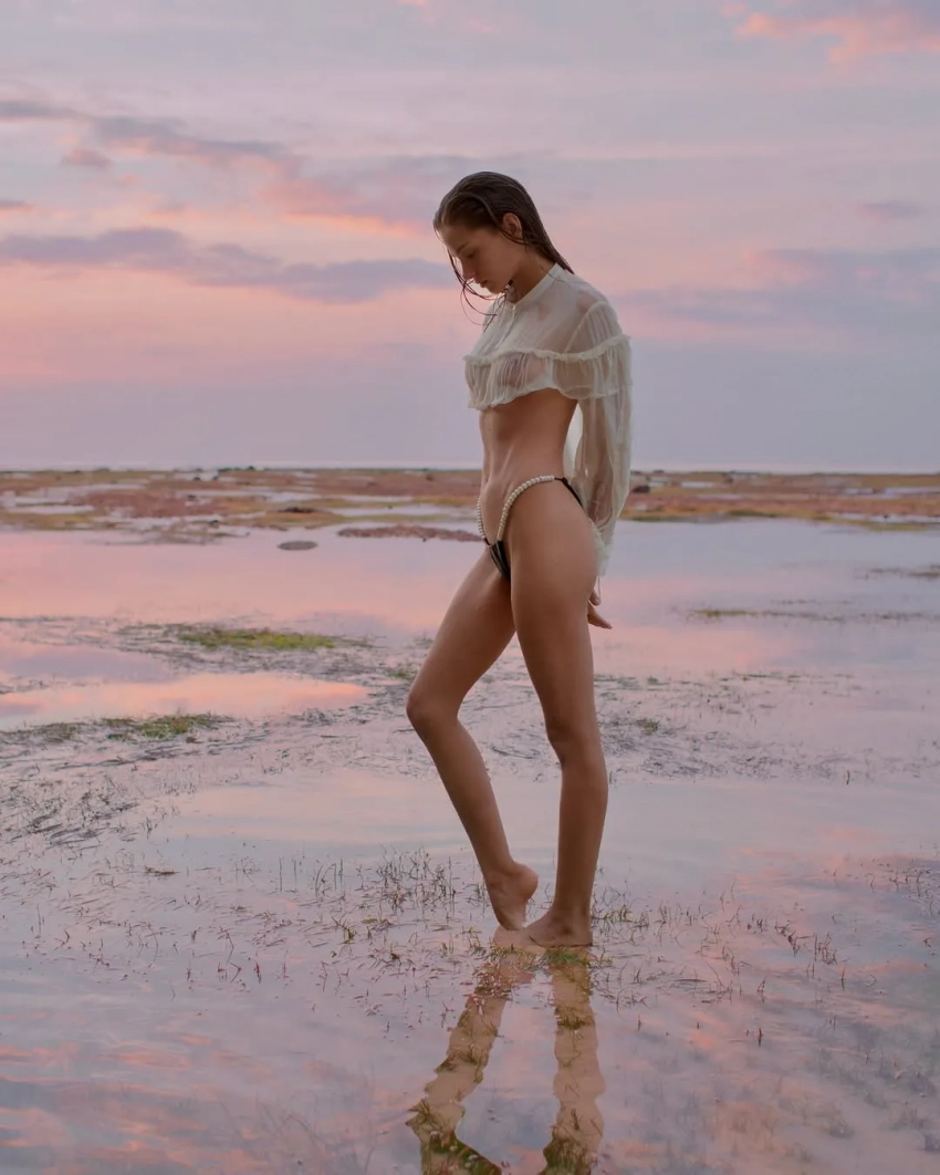 26-летняя Алеся Кафельникова, которая недавно вместе с мужем отпраздновала четвёртый день рождения дочери Киары, снялась в новой фотосессии на острове Бали. На снимках модель позирует на пляже в прозрачной блузке и плавках с жемчугом, а также в платье кроше и рубашке.