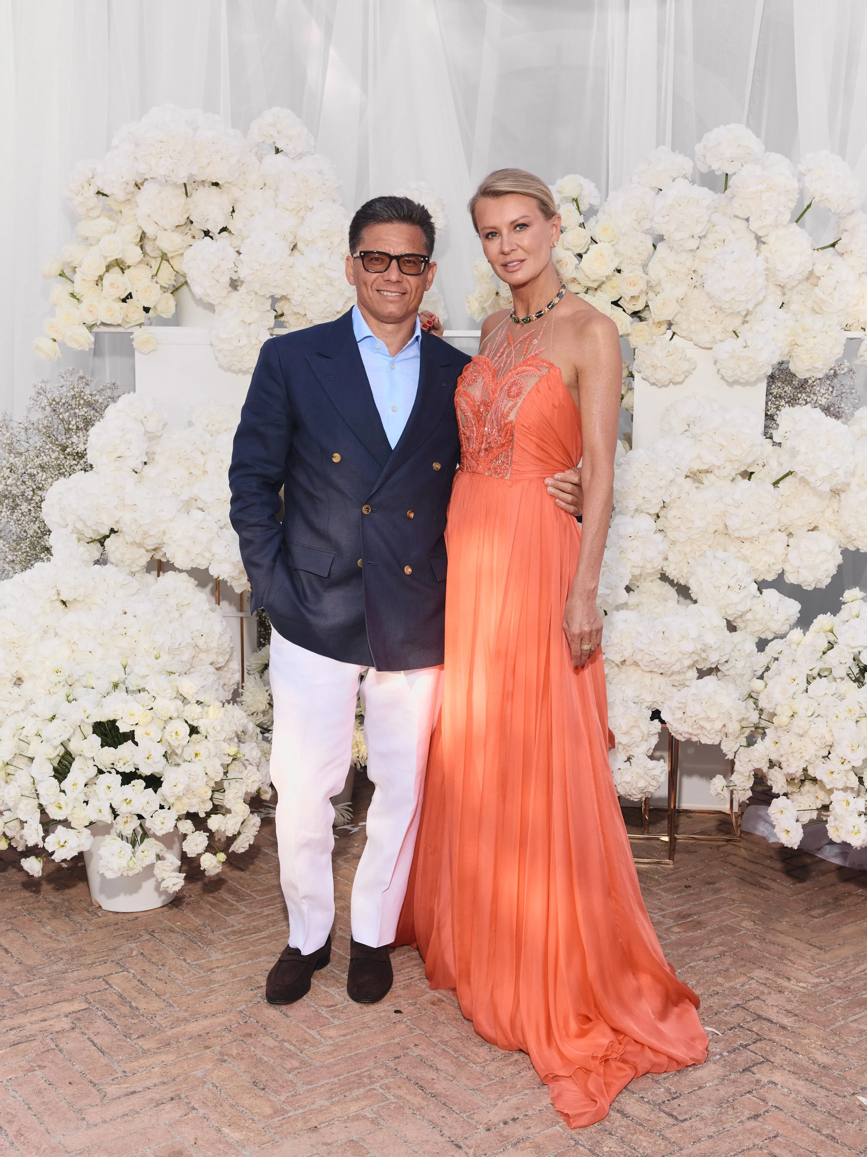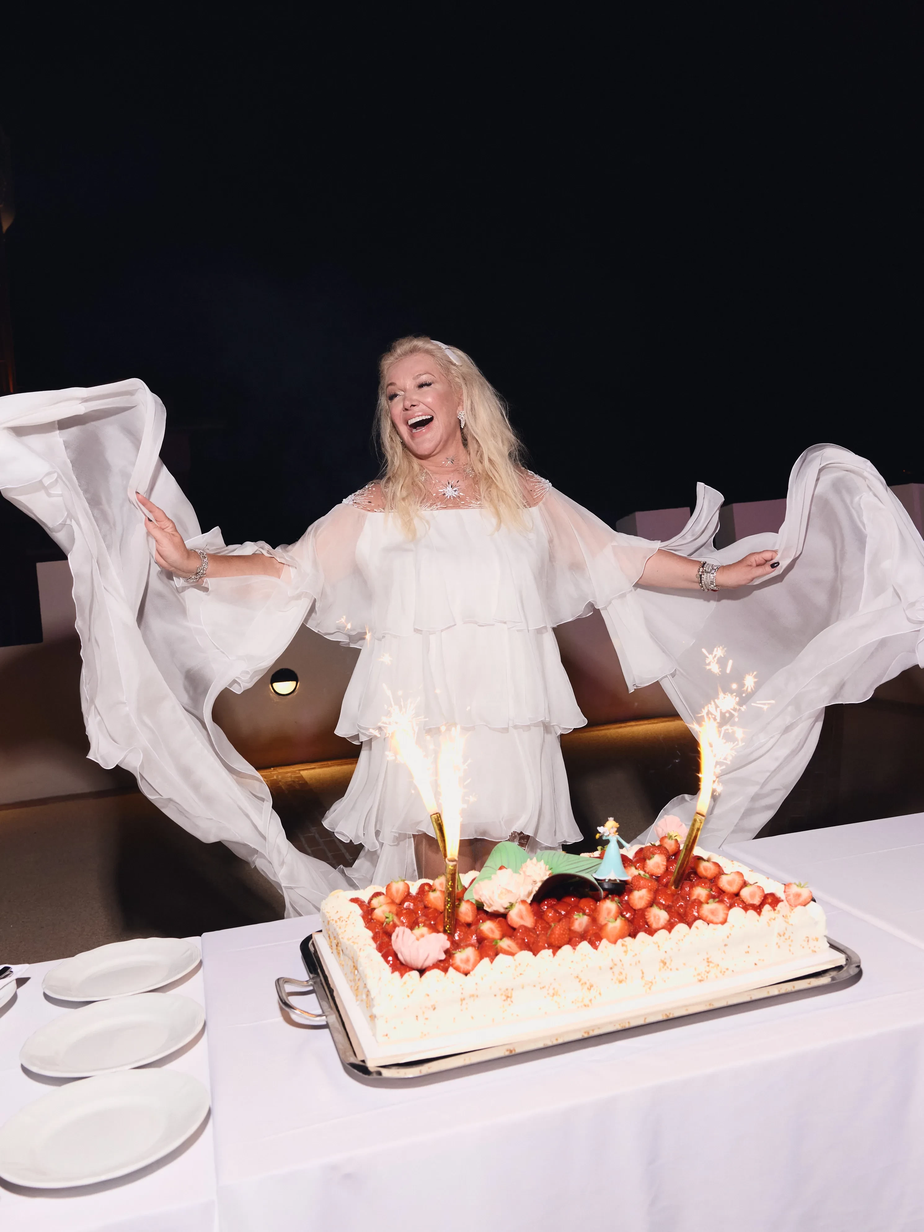 Центральным событием вечера стал показ мод, в ходе которого подруги дизайнера вышли на импровизированный подиум, чтобы представить наряды различных периодов существования бренда. Сама именинница тоже была в платье своего бренда.