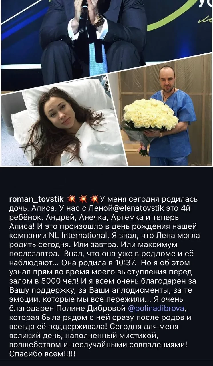 Роман и Елена ТовстикРоман и Елена ТовстикРоман и Елена ТовстикРоман и Елена Товстик с детьмиРоман Товстик с детьмиРоман и Елена Товстик с детьмиНовость о разводе Товстика появилась на волне слухов о расставании Полины Дибровой с мужем Дмитрием Дибровым после 16 лет брака. Сама Полина тогда заявила, что это неправда, но информацию о романе с Товстиком она не комментирует. Дмитрий Дибров вообще никаких официальных комментариев на тему не давал.