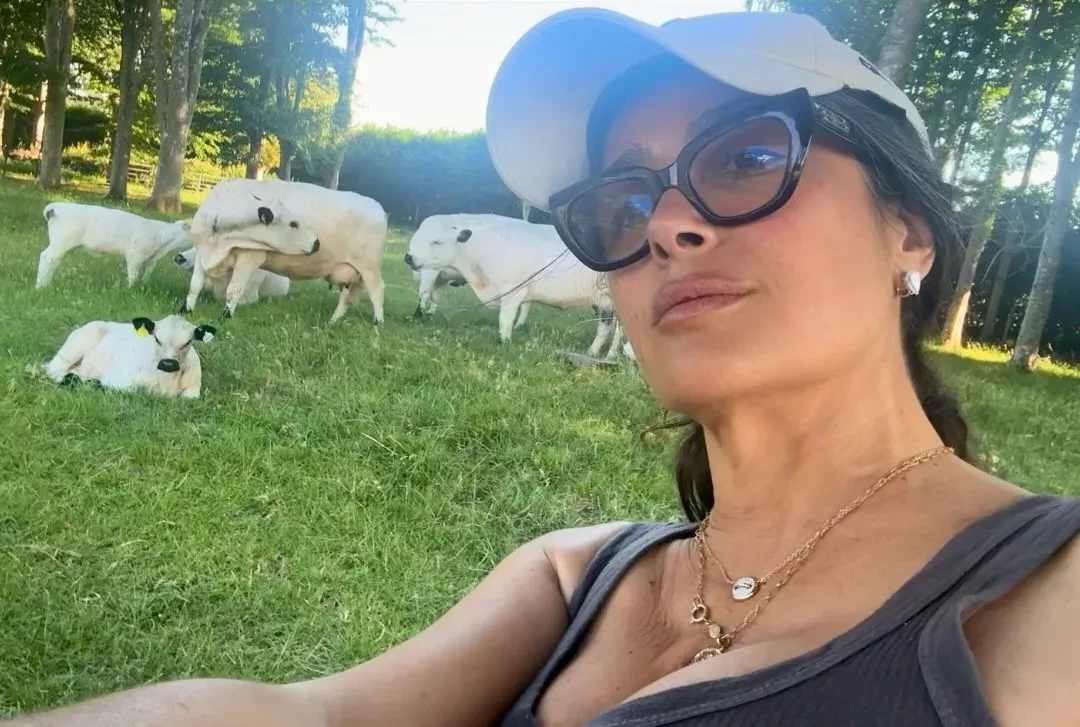 "Жизнь на ферме", — подписала Сальма фотографии, на которых она делает селфи на фоне коров, а подруги позируют в бикини на шезлонгах.