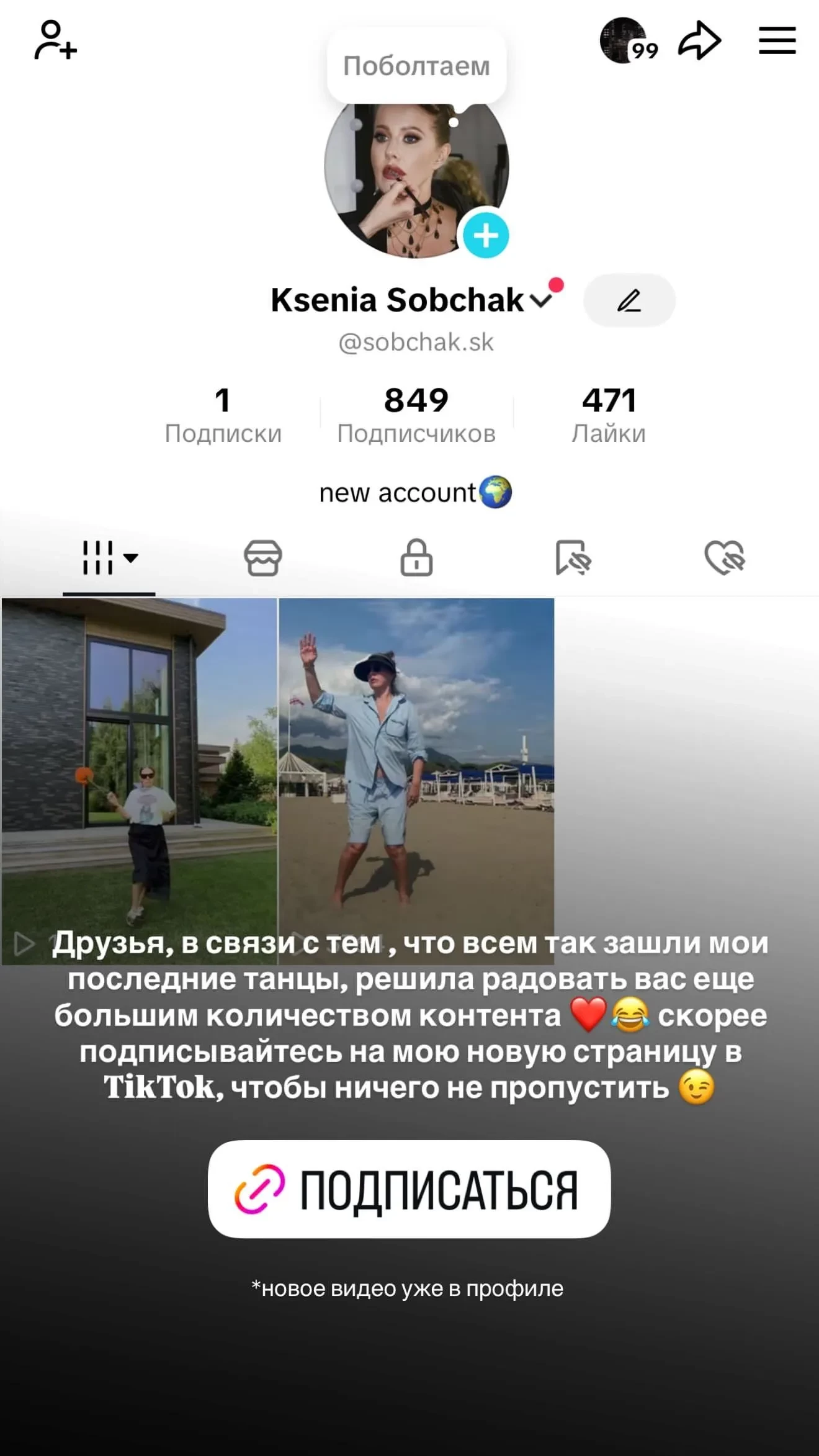 Собчак опубликовала скрин своего нового аккаунта, который, вероятно, будет посвящён исключительно танцам. "Друзья, в связи с тем, что всем так зашли мои последние танцы, решила радовать вас ещё большим количеством контента", — написала Ксения. До этого у неё уже был аккаунт в тиктоке, однако он был посвящён её интервью: там публиковались короткие отрывки из них. На новом аккаунте уже есть два видео с танцами на пляже и на траве. Несмотря на это, на аккаунт Собчак подписалось уже более тысячи человек.