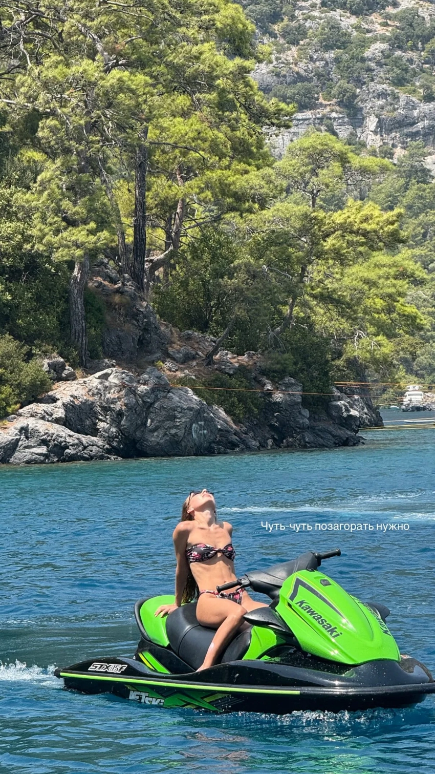 Она попозировала в бикини, стоя в воде на фоне скал, и показала, как катается на водном мотоцикле. Пост лайкнула сводная сестра Александры Елизавета Пескова.