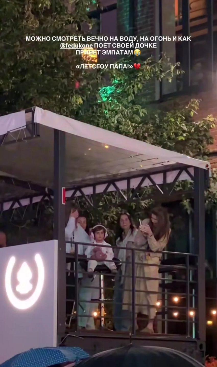 Вместе с мамой она расположилась на VIP-местах, совершенно не ожидая, что последует дальше. 34-летняя Саша надела на дочь наушники, чтобы та не пострадала от слишком громкого звука. Когда 33-летний Федук (настоящее имя — Фёдор Инсаров) вышел на сцену и начал исполнять песню “Краски”, Нина сначала спокойно аплодировала, не понимая, кто перед ней, но потом узнала отца и пришла в восторг. Видео, запечатлевшее трогательный момент, артист опубликовал в своих соцсетях.