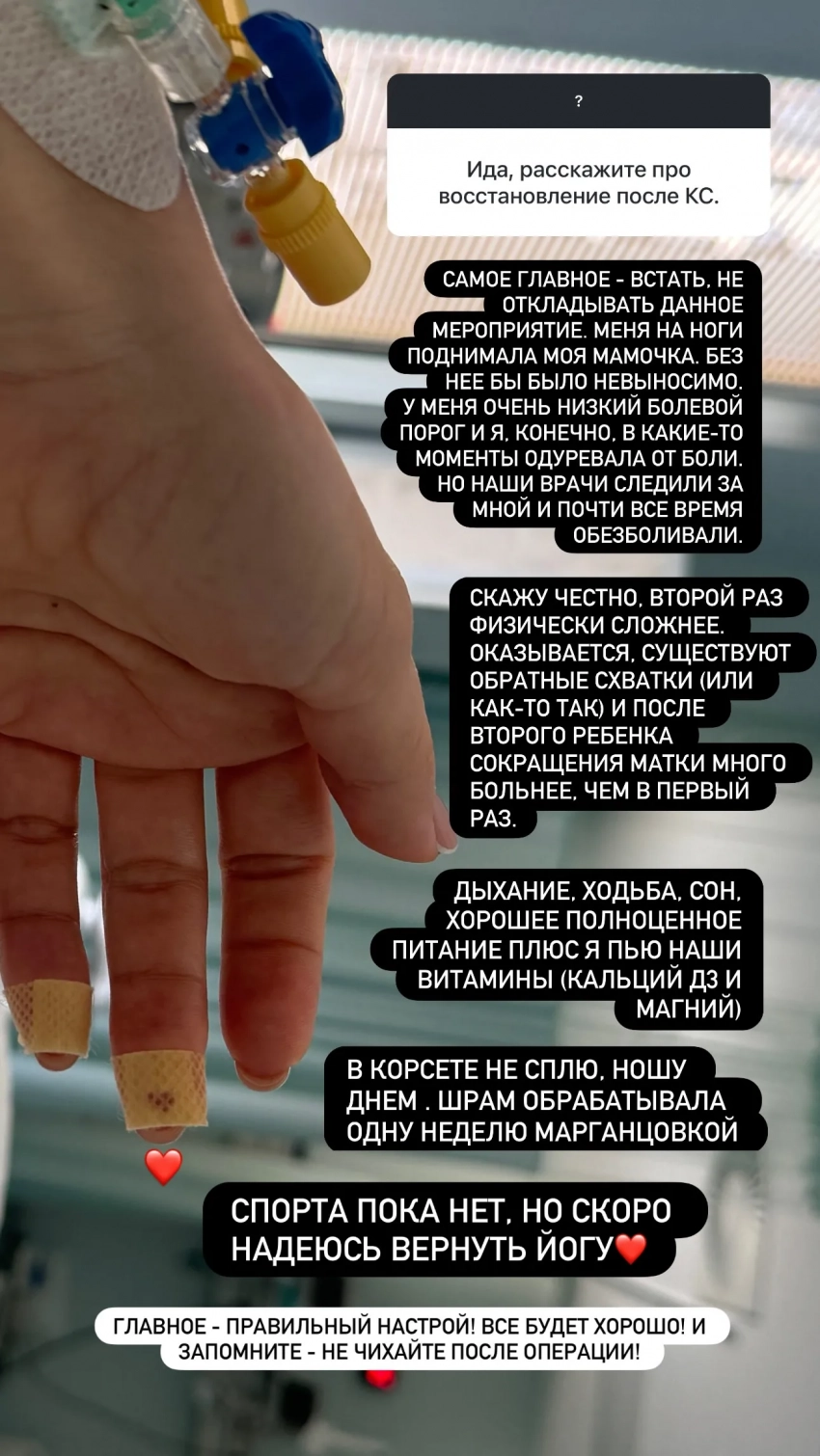 Сторис* Иды ГаличИда также отметила, что сейчас у неё один из самых сложных периодов в жизни: "Надо успеть всё — наладить грудное вскармливание до выхода из декрета (у меня месяц), вернуться в форму, подготовиться к тотальному рабочему марафону, придерживаться всех ограничений по питанию и не сойти с ума".