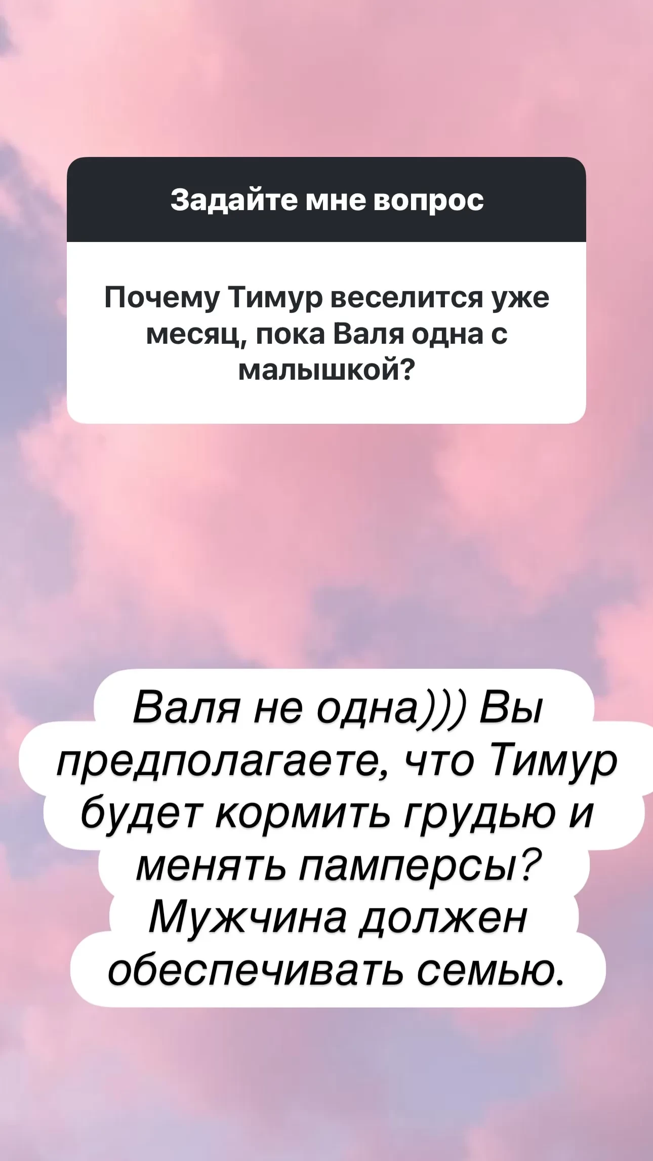 "Это его работа и заработок. Валя не одна. Вы предполагаете, что Тимур будет кормить грудью и менять памперсы? Мужчина должен обеспечивать семью", — написала Юнусова.