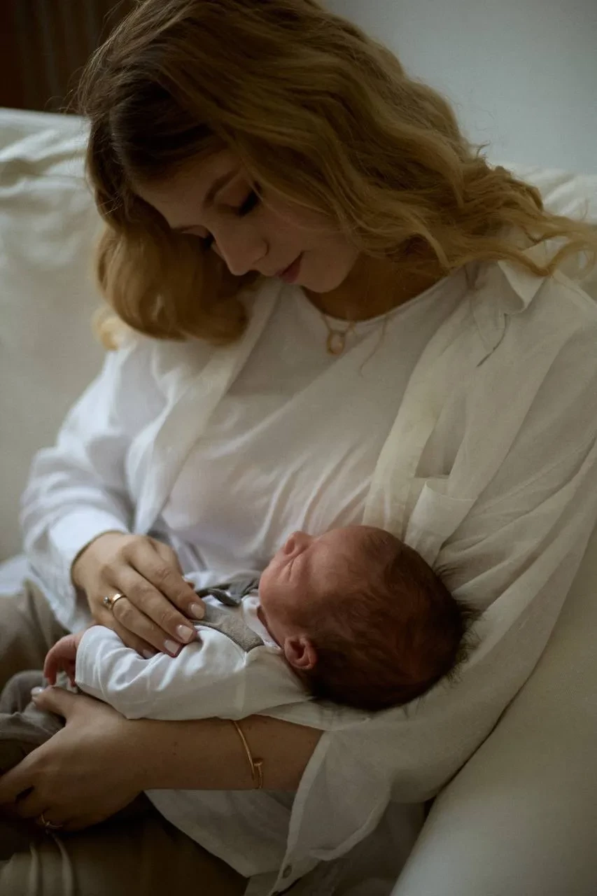 "Наша первая фотосессия с Мишей", — подписала Александра фото, на которых она позирует с новорождённым ребёнком.