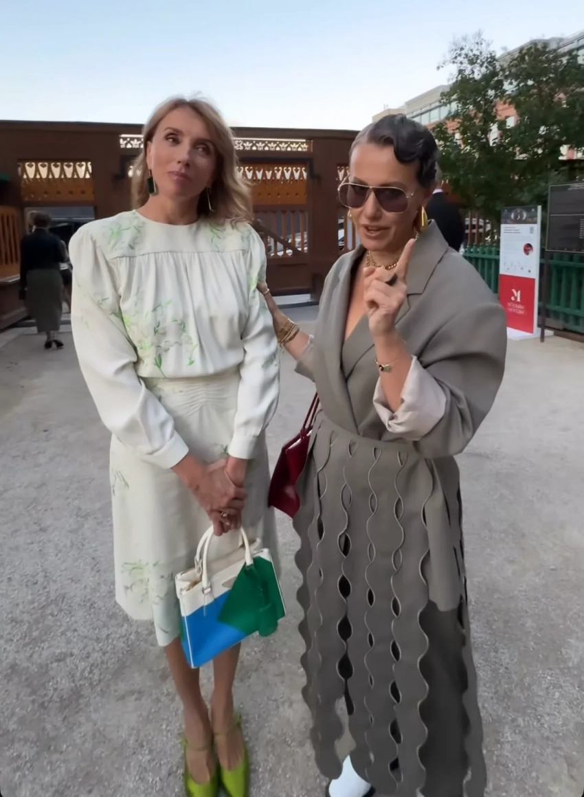 43-летняя Ксения Собчак приехала на показ сразу после линейки сына Платона. Ведущая надела костюм Ruban, который дополнила сумкой Phoebe Philo, колье Bvlgari, обувью Jil Sander и серьгами Bottega Veneta. Перед шоу Ксения встретила Светлану Бондарчук и сделала комплимент её винтажному платью Miu Miu.