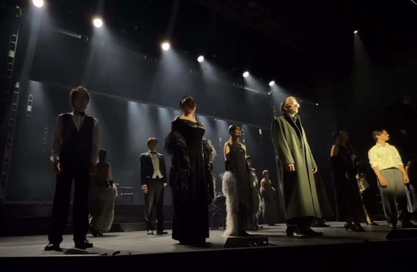 Для выхода в свет Алеся выбрала чёрный брючный костюм и перчатки, расшитые кристаллами.