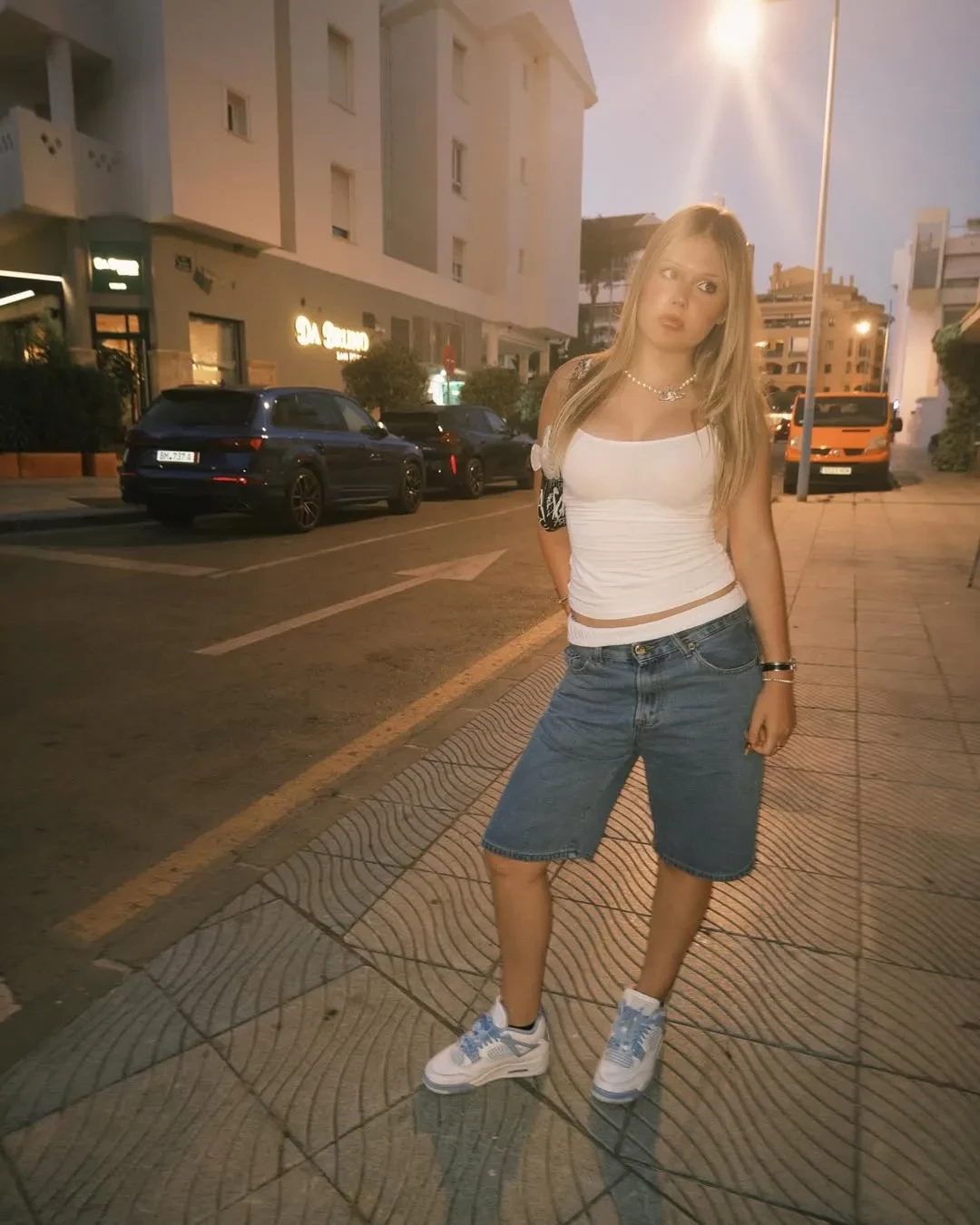 На фото 13-летняя девочка позирует на одной из улиц Марбельи в обтягивающем топике с пуш-апом и в бермудах, из-под которых у неё выглядывает нижнее бельё. Судя по снимку, перед выходом она также нанесла макияж на лицо.
