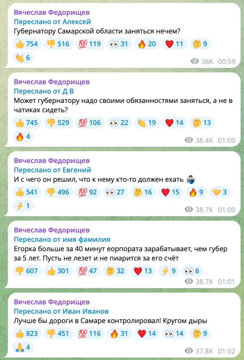 Вячеслав Федорищев Вскоре после этого в канале Федорищева появились репосты комментариев с критикой в его адрес, из-за чего пользователи сети предположили, что его аккаунт был взломан. Чуть позже чиновник опубликовал видео, в котором сообщил, что принял решение перейти в мессенджер MAX. Сейчас его канал в Telegram удалён.