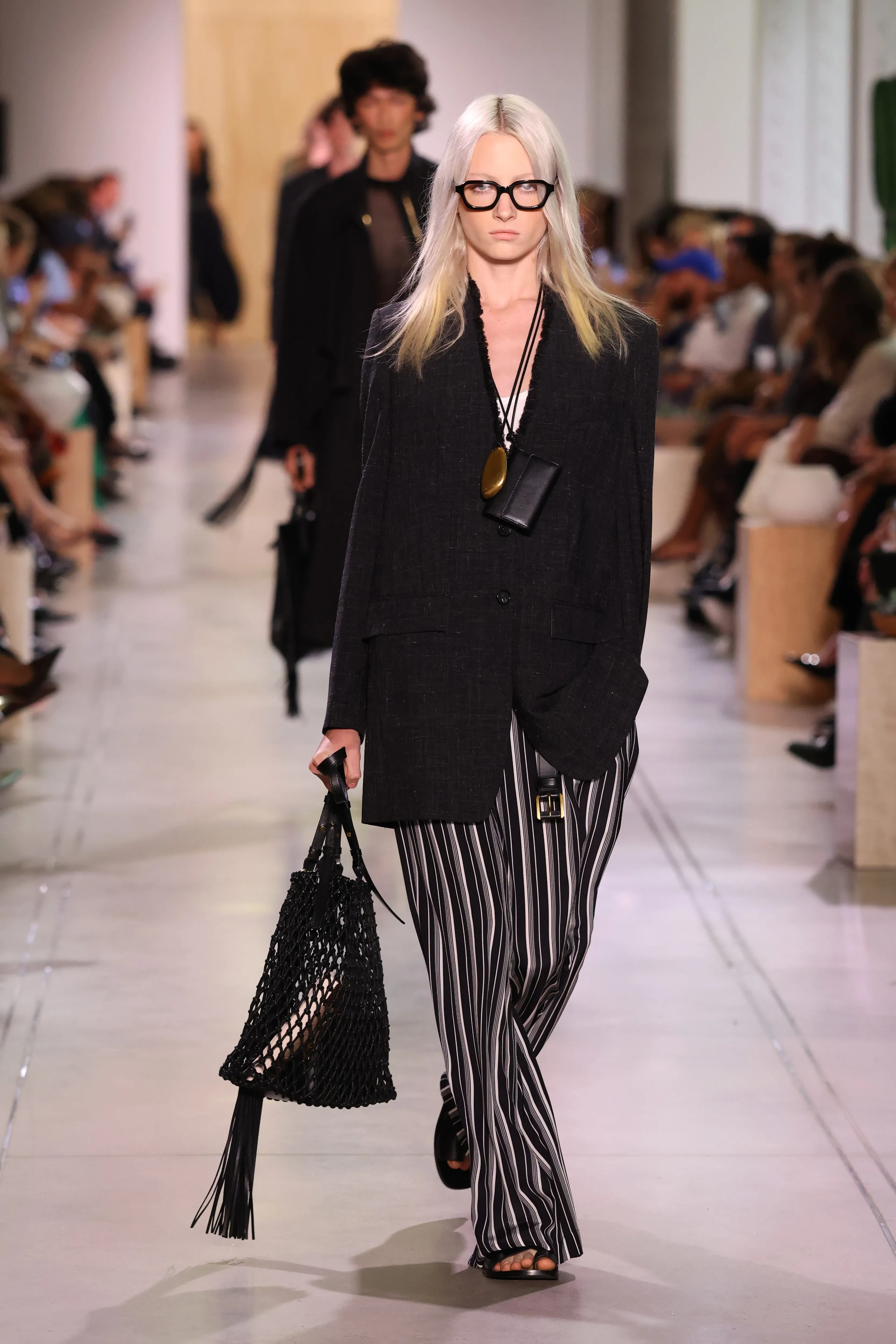 16-летний Кай Шрайбер, который в прошлом сезоне дебютировал как модель на шоу Valentino, вышел на подиум в брюках в полоску свободного кроя, тёмно-сером пиджаке и с осветлёнными волосами.