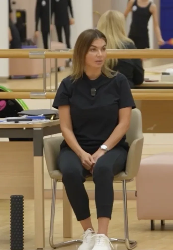 42-летняя олимпийская чемпионка появилась в зале в чёрной футболке, брюках и белых кроссовках. Кабаева не только наблюдала за работой воспитанниц, но и показывала им некоторые элементы.