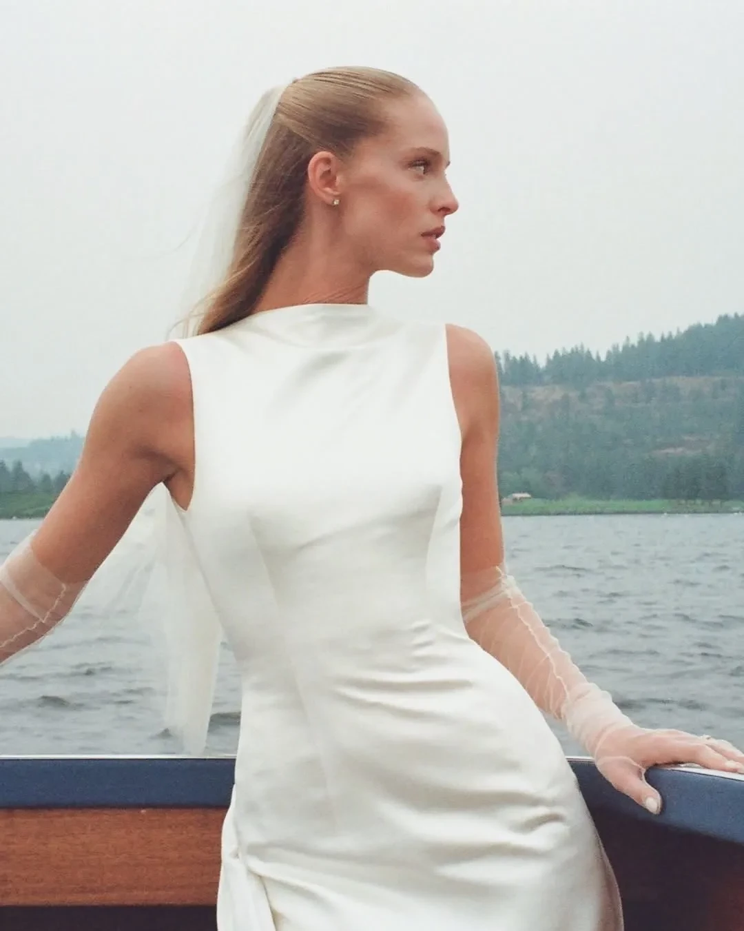 Эбби Чемпион и Патрик Шварценеггер Патрик Шварценеггер с родителями и Эбби Чемпион К алтарю Эбби прошла в кастомном платье авторства Даниэль Франкель, сшитом из шёлка и шерсти, с высоким воротом и глубоким V-образным вырезом на спине. Образ дополняли юбка-шлейф с расписанной вручную подкладкой, тюлевые перчатки и фата. Из украшений на модели были бриллиантовые серьги-гвоздики и жемчужное кольцо от Mackenna Thaler Jewelry.