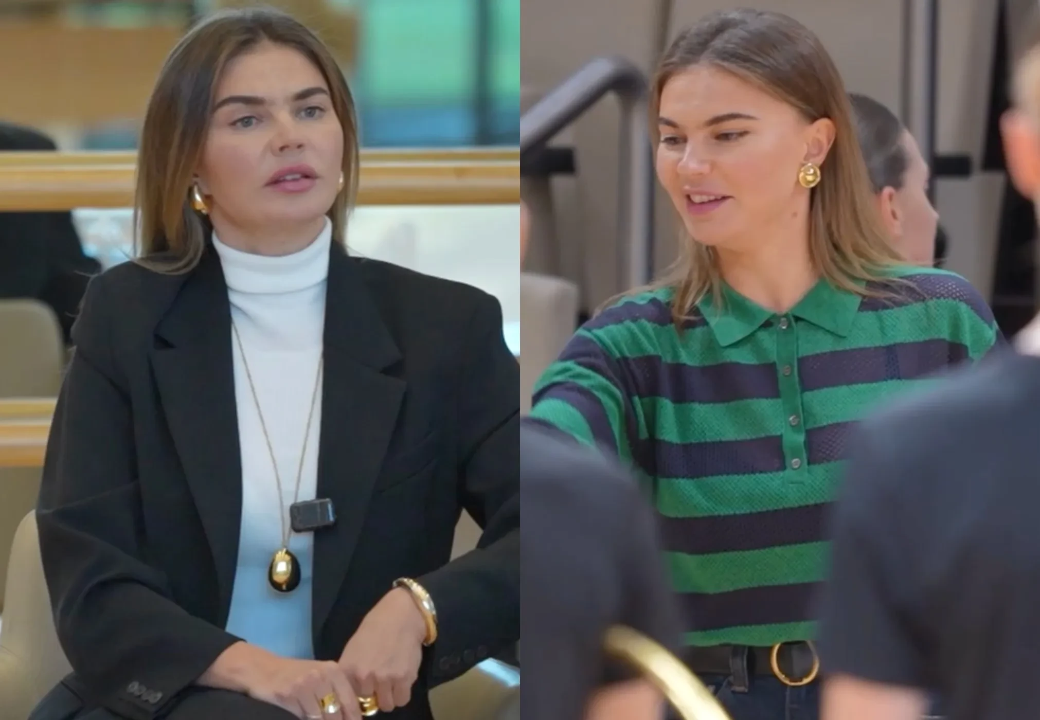 Вчера Алина появилась в зале в чёрном брючном костюме, белой водолазке и ботинках, дополнив образ золотыми украшениями: массивной подвеской, серьгами, браслетом и кольцами.