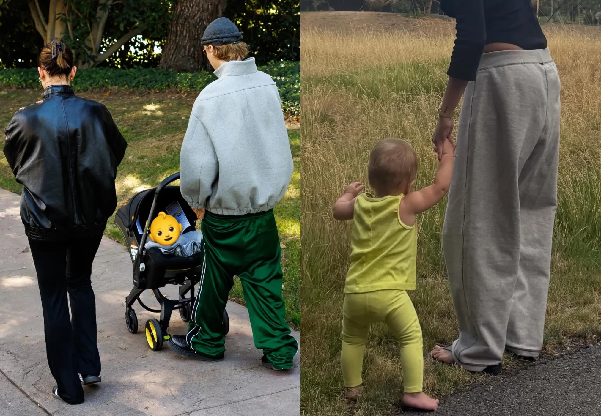На одном фото супруги запечатлены идущими по дороге с коляской, на другом — 28-летняя Хейли держит уже подросшего сына за руку, пока тот делает первые шаги.