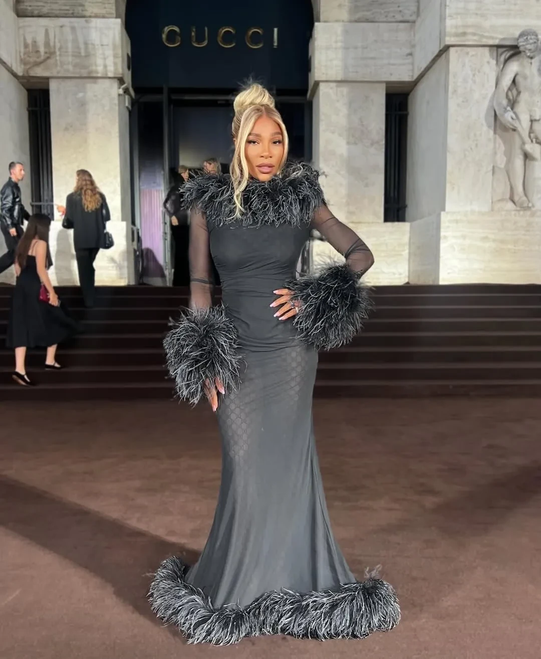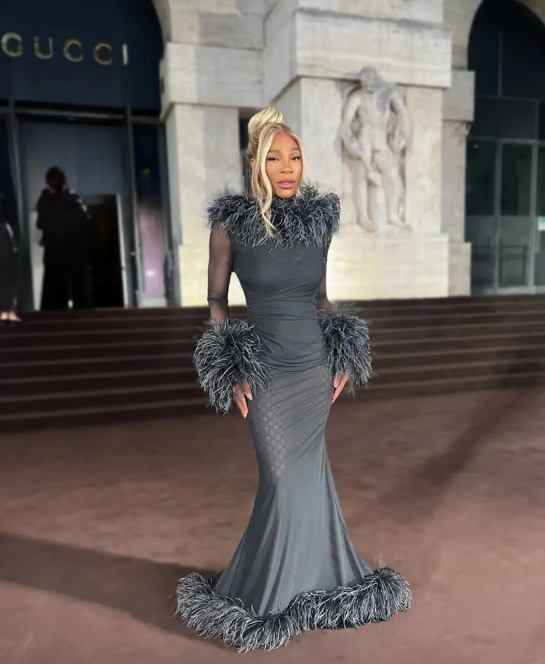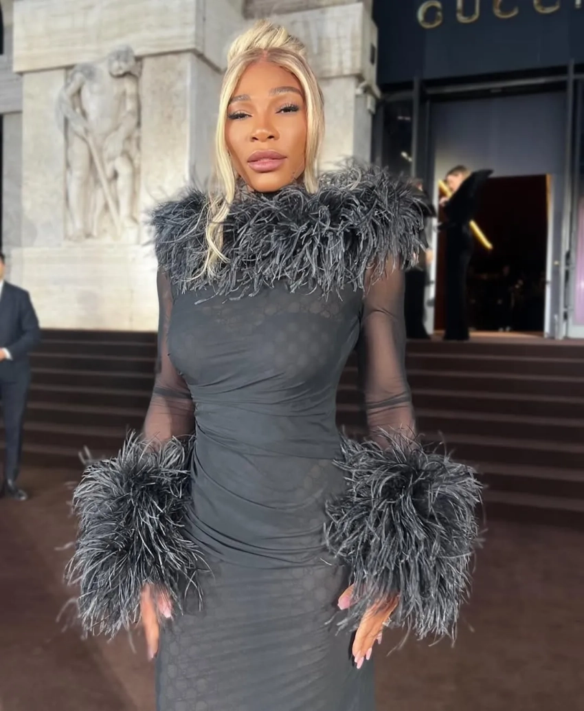 Серена позировала фотографам в чёрном полупрозрачном платье Gucci с перьями, а её образ дополнила высокая причёска.