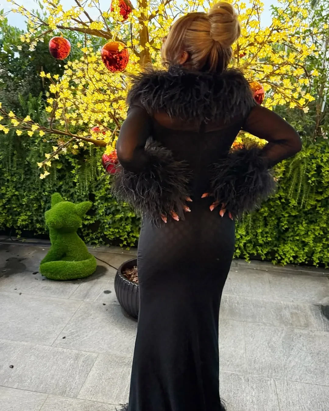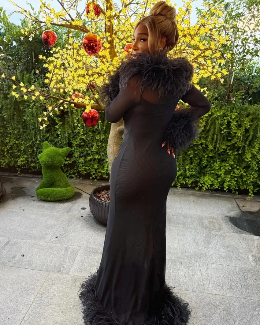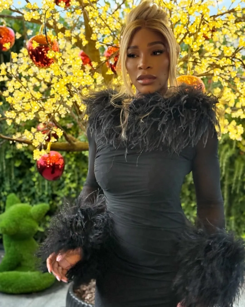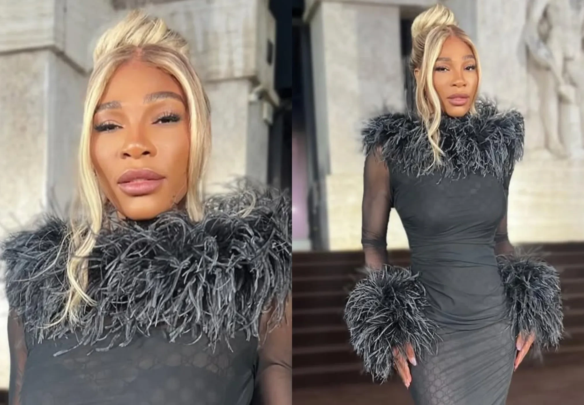 Серена позировала фотографам в чёрном полупрозрачном платье Gucci с перьями, а её образ дополнила высокая причёска.