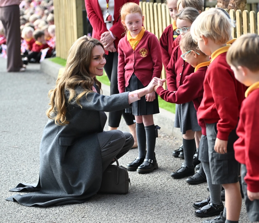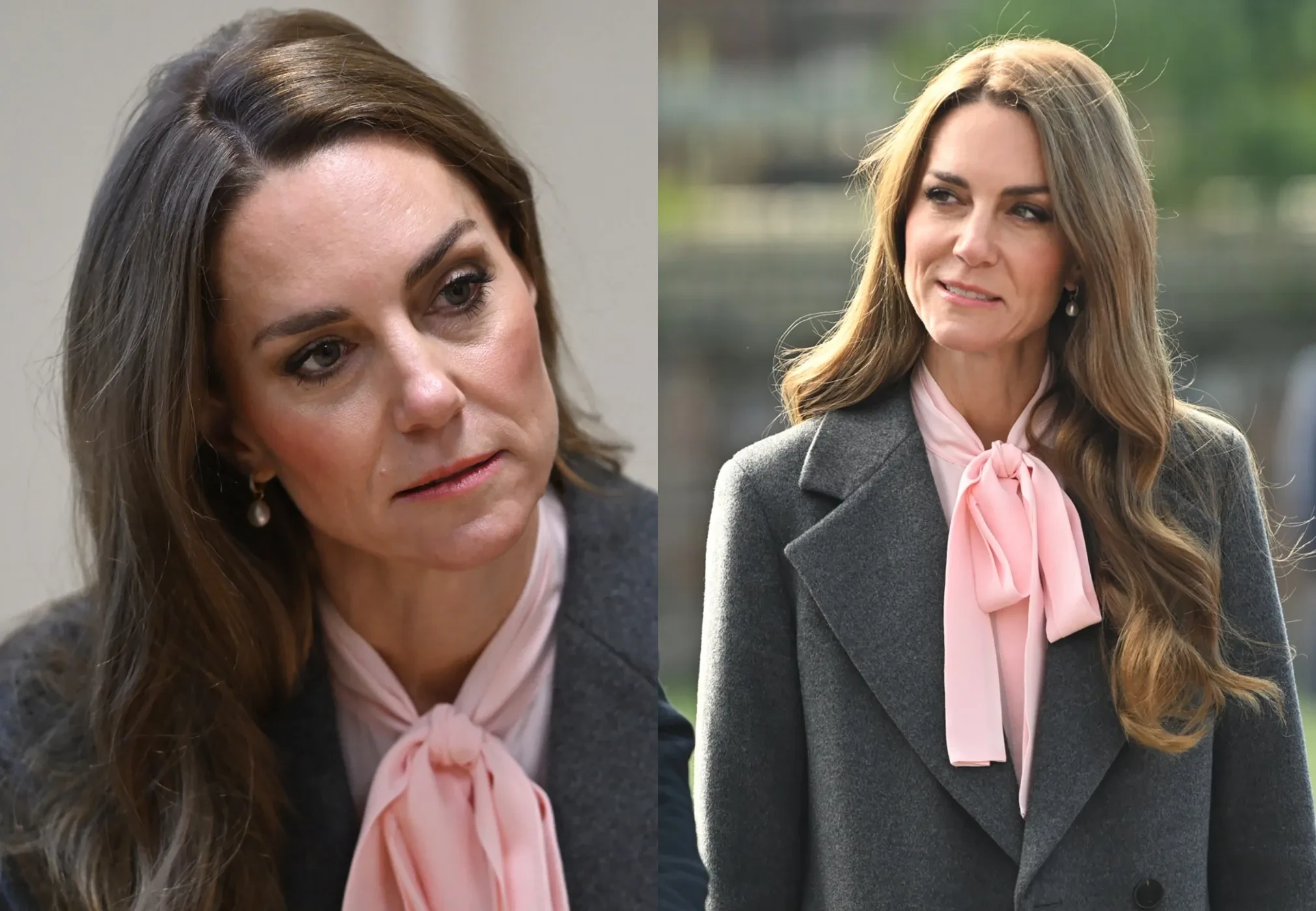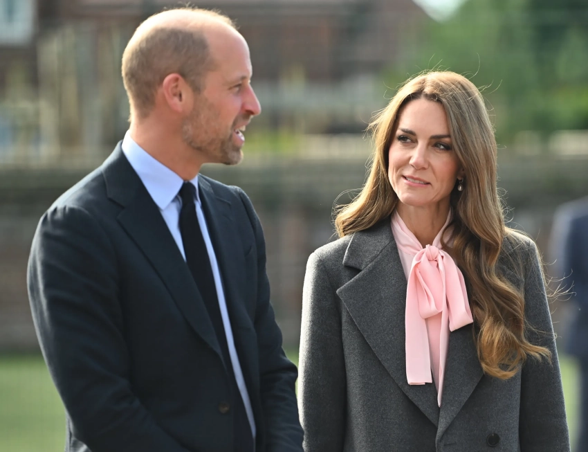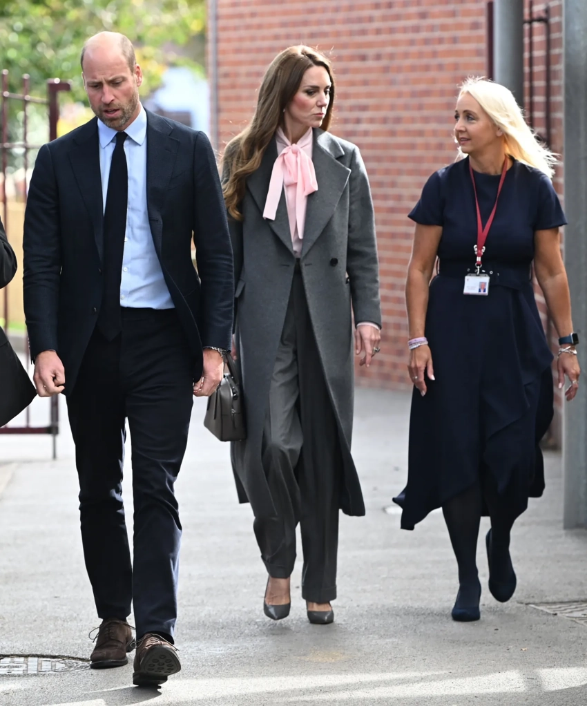 Для визита 43-летняя принцесса Уэльская, вокруг которой ходят слухи о рецидиве рака, надела серое пальто прямого силуэта, широкие брюки в тон и розовую блузу с бантом, а 43-летний принц Уильям выбрал классический костюм с галстуком.
