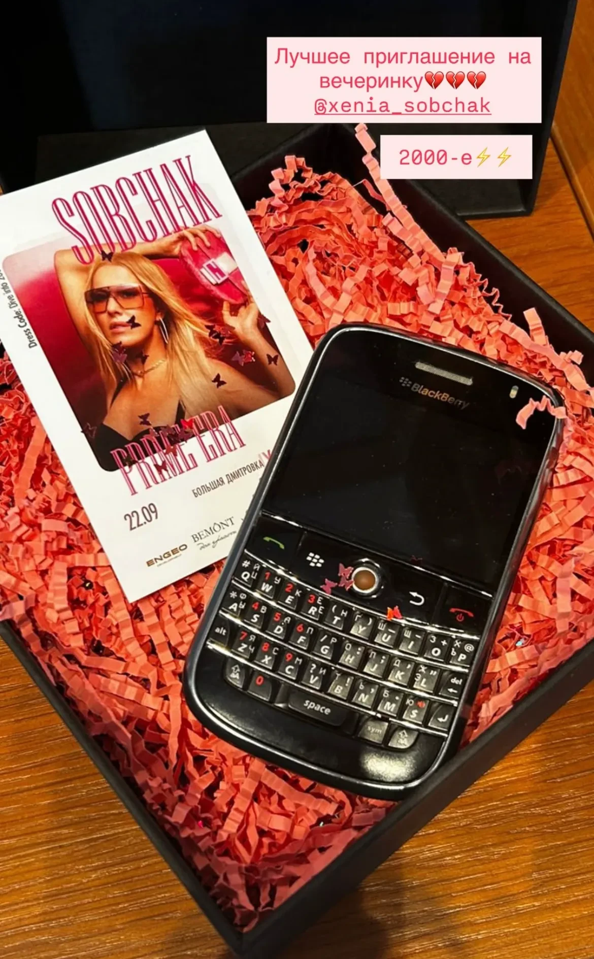 Ещё за несколько дней до вечеринки в сети завирусились фото и видео необычных приглашений на мероприятие от Собчак. Ксения прислала гостям настоящие мобильные телефоны эпохи нулевых со своим фото на заставке и голосовым приглашением.