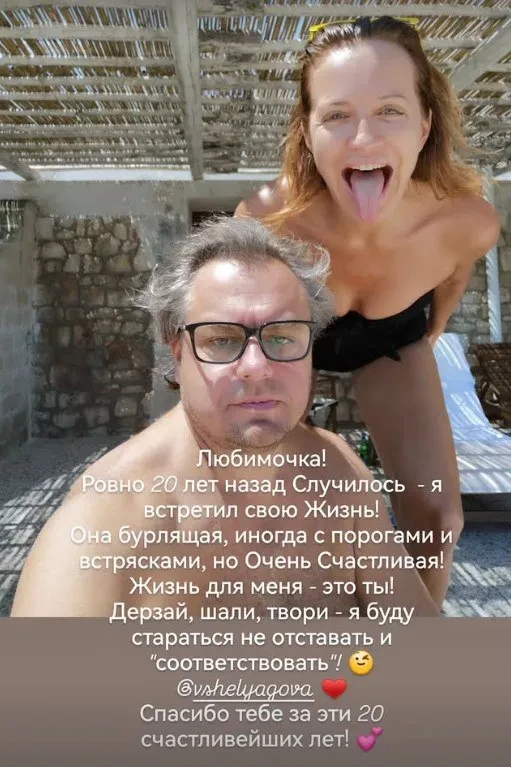 Виктория и Олег ШеляговыОлег, в свою очередь, также поздравил любимую, опубликовав архивное совместное фото с подписью: "Любимочка! Ровно 20 лет назад Случилось — я встретил свою Жизнь! Она бурлящая, иногда с порогами и встрясками, но Очень Счастливая! Жизнь для меня – это ты! Дерзай, шали, твори – я буду стараться не отставать и "соответствовать"! Спасибо тебе за эти 20 счастливейших лет! (
