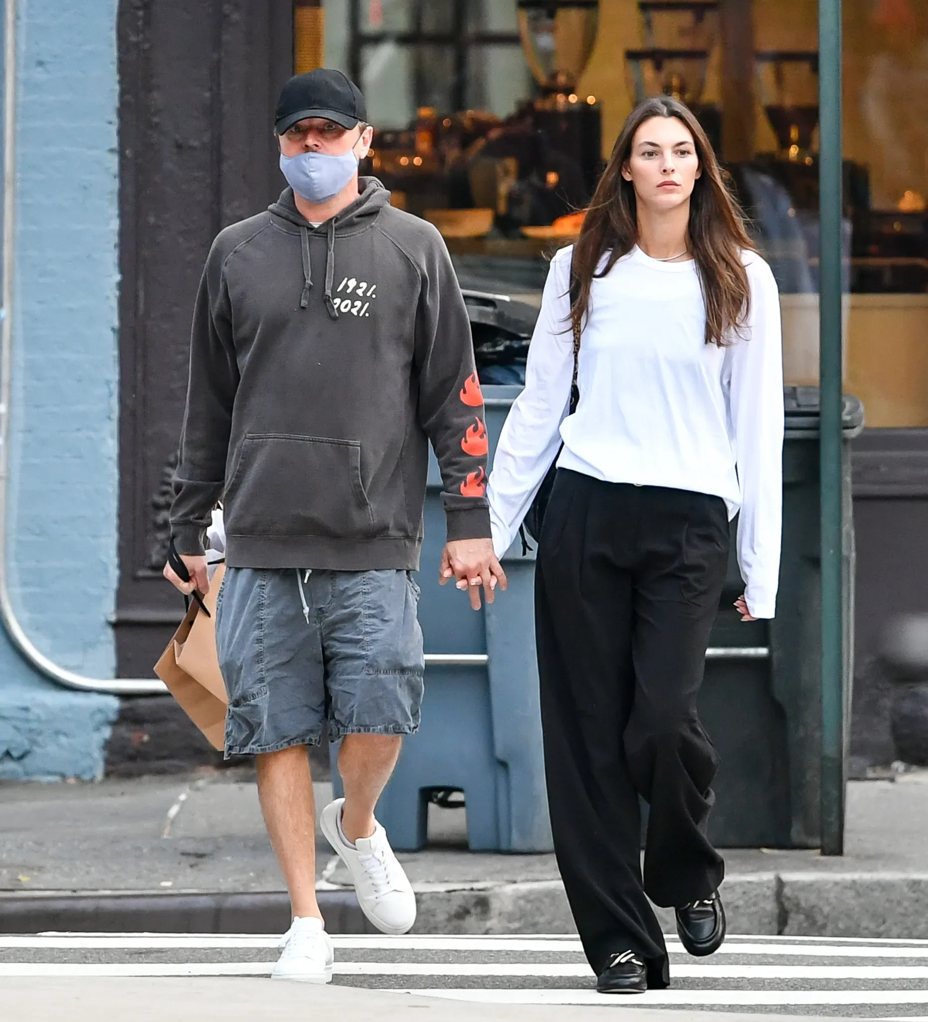 Для выхода пара выбрала расслабленные образы: Черетти была в белом лонгсливе и чёрных широких брюках, а ДиКаприо надел шорты и толстовку похожих оттенков, дополнив образ кепкой и маской, без которых редко появляется на публике. В руках звезда "Титаника" нёс пакет с покупками.