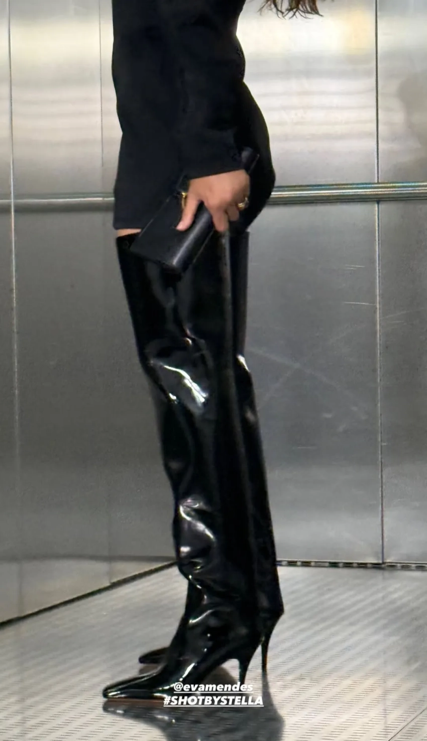 На одном из кадров Ева запечатлена за рабочим столом в строгом наряде: белой блузке, серой юбке миди и чёрных туфлях на каблуках, при этом на ногах у неё чёрные кружевные чулки.