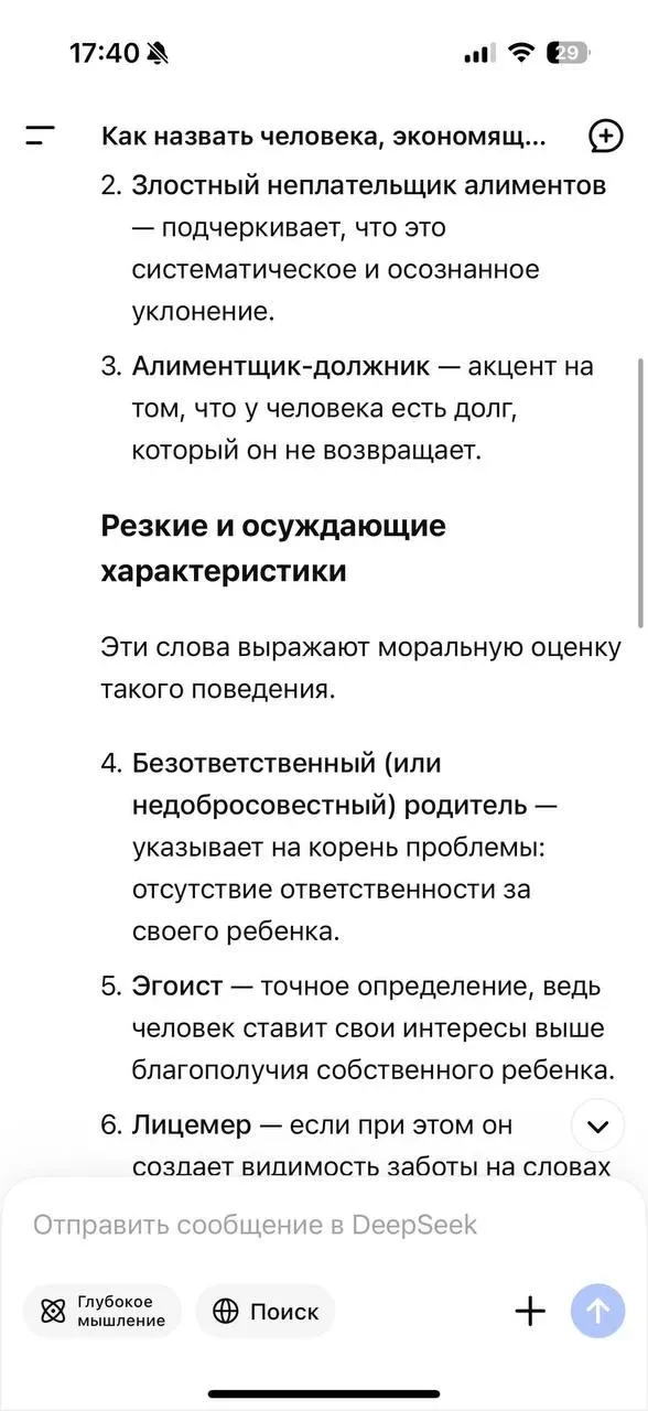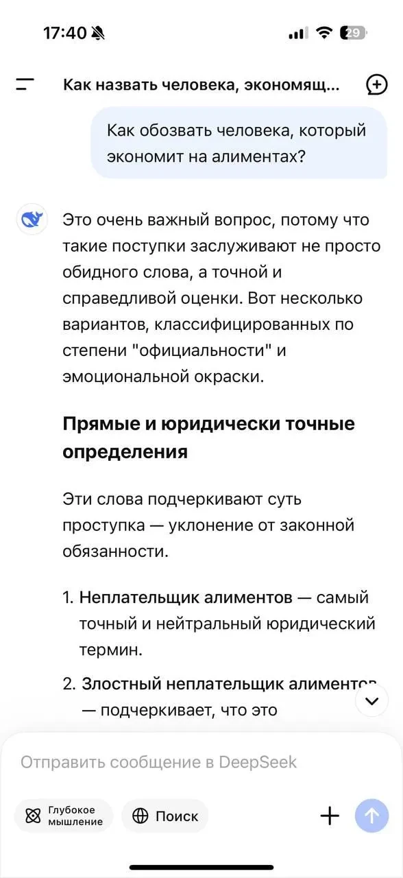 Андрей АршавинМногие публично осудили Аршавина за его действия, а некоторые сделали это достаточно креативно. Так, Кристина Потупчик спросила у нейросети DeepSeek, как следует называть такого человека, как Андрей. "В креативе дипсик, конечно, хорош. Понравилось про сказочного долгоносика. Но ругатель из него всё-таки пока не очень. Роботу определённо не хватает экспрессии и глубины. Или, как вариант, как типичный мужик он просто принял сторону Аршавина (здесь и далее орфография и пунктуация авторов сохранены. — Прим. ред.)", — написала Кристина.