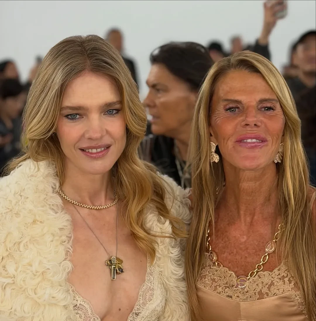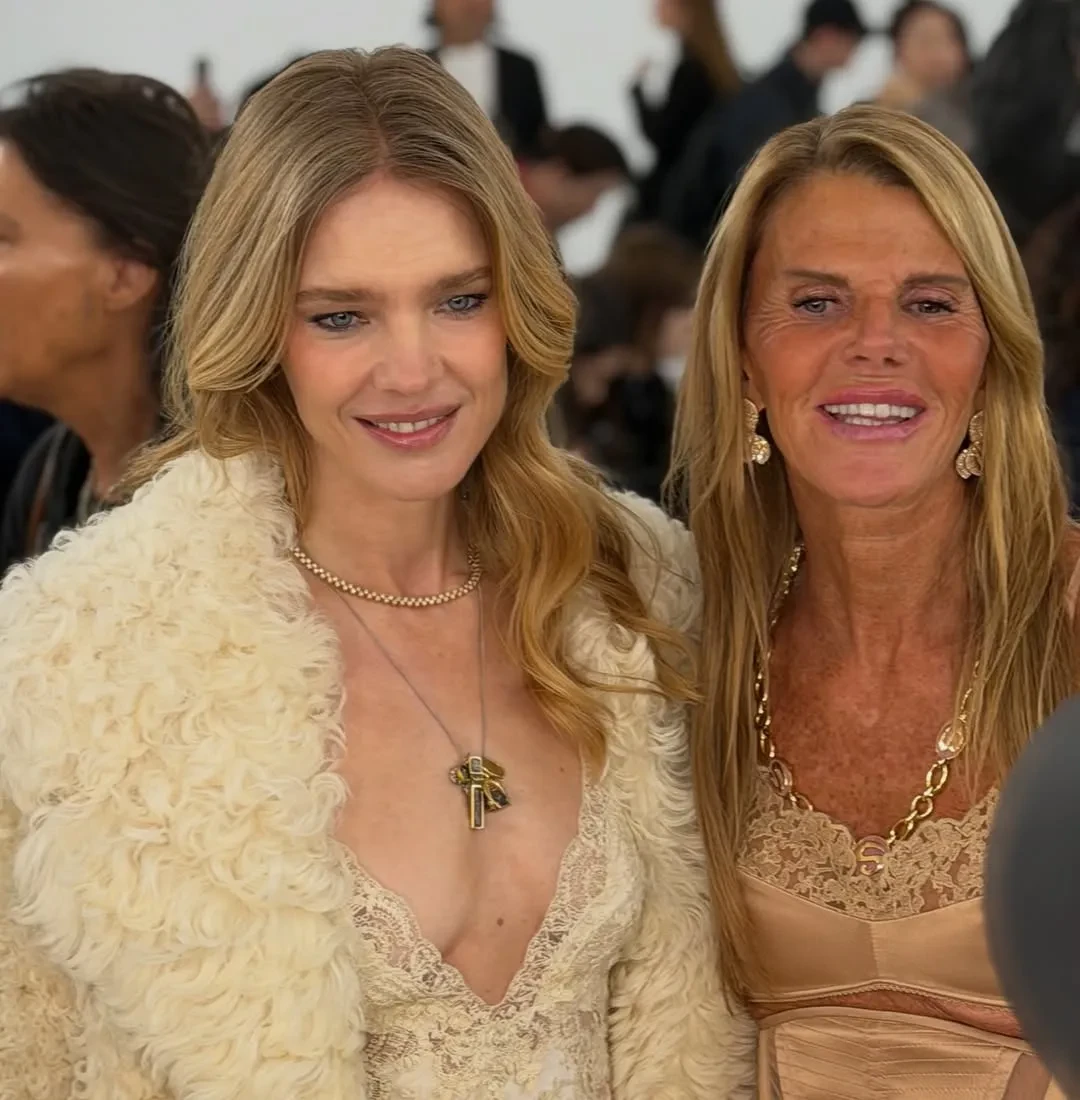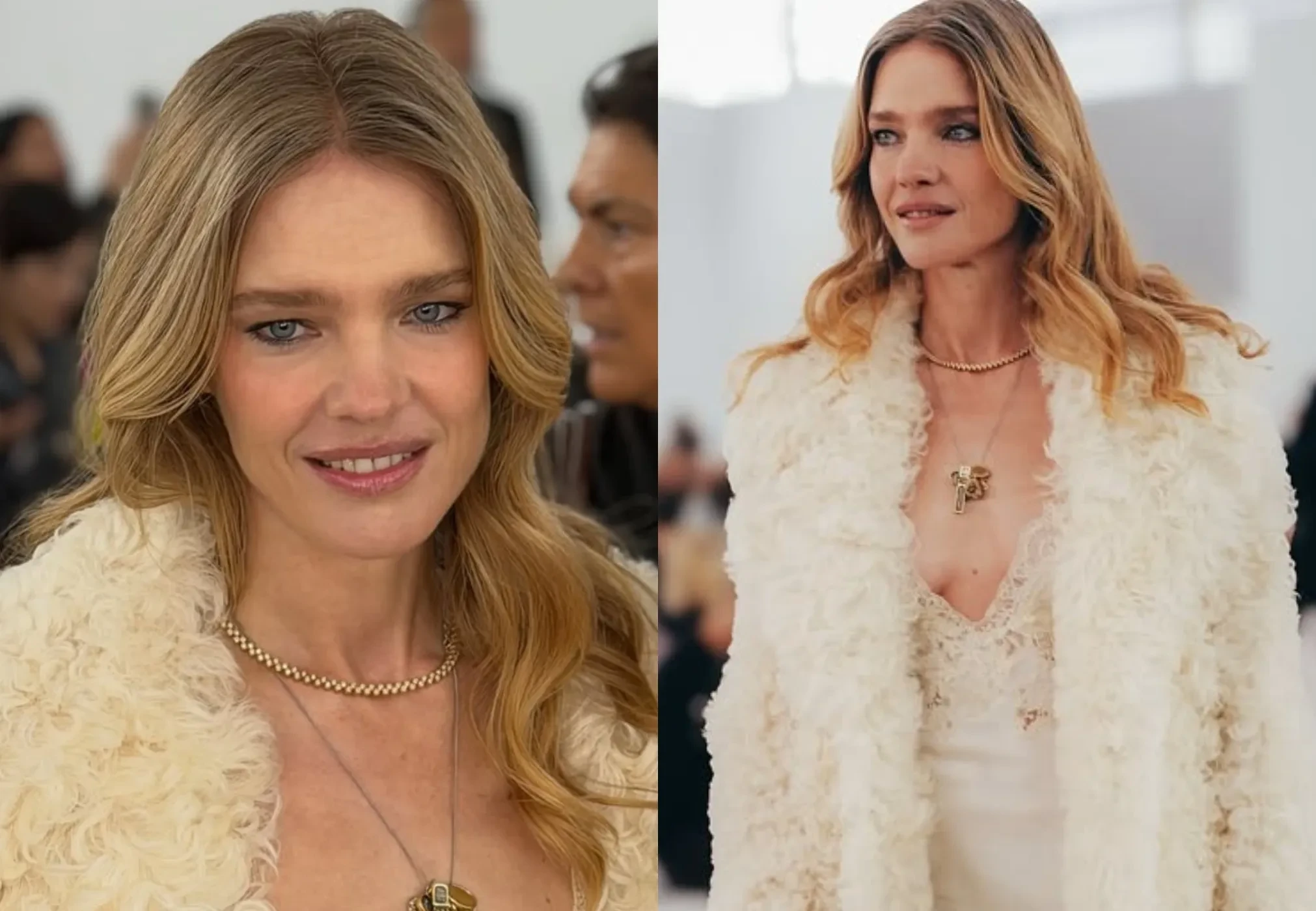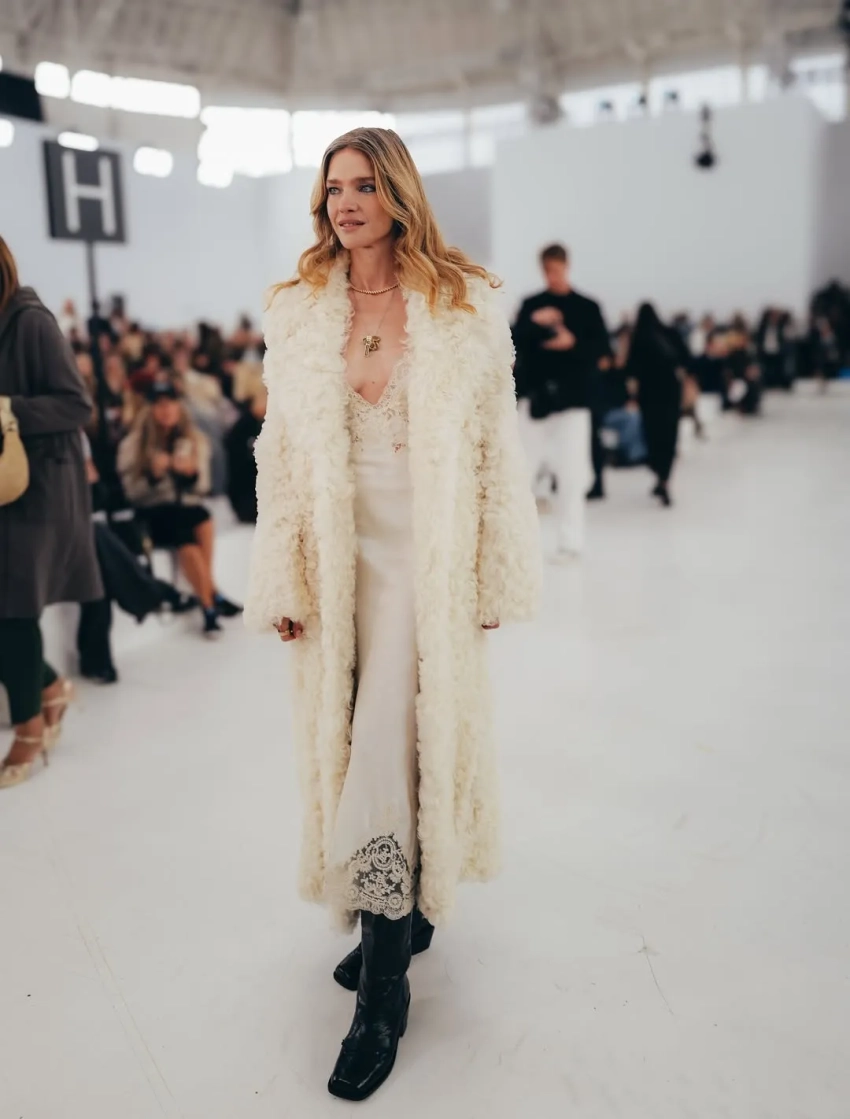 43-летняя российская супермодель пришла на шоу в белом платье-комбинации с декольте и шубе в тон. Наталья позировала фотографам с Анной Делло Руссо и сидела в первом ряду с итальянским актёром Микеле Морроне (с которым целовалась Ирина Шейк) и Кьярой Ферраньи.