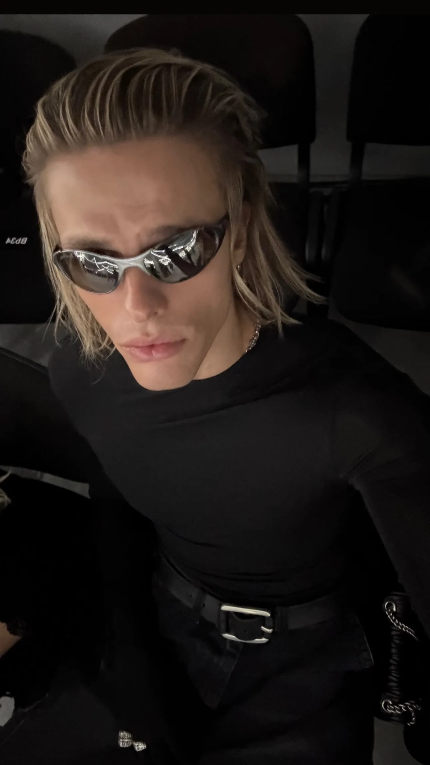 Для выхода в свет 39-летняя Перминова выбрала экстремально короткое чёрное мини-платье с разрезом на бедре, дополнив образ остроносыми туфлями на шпильке и пиджаком. Волосы модель уложила мягкими волнами, подтвердив догадки, что её недавняя "короткая стрижка" была париком. Романов тоже остановился на total black стиле: на нём была полупрозрачная водолазка с рукавами-перчатками и свободные джинсы. Свой лук манекенщик завершил футуристичными солнцезащитными очками.