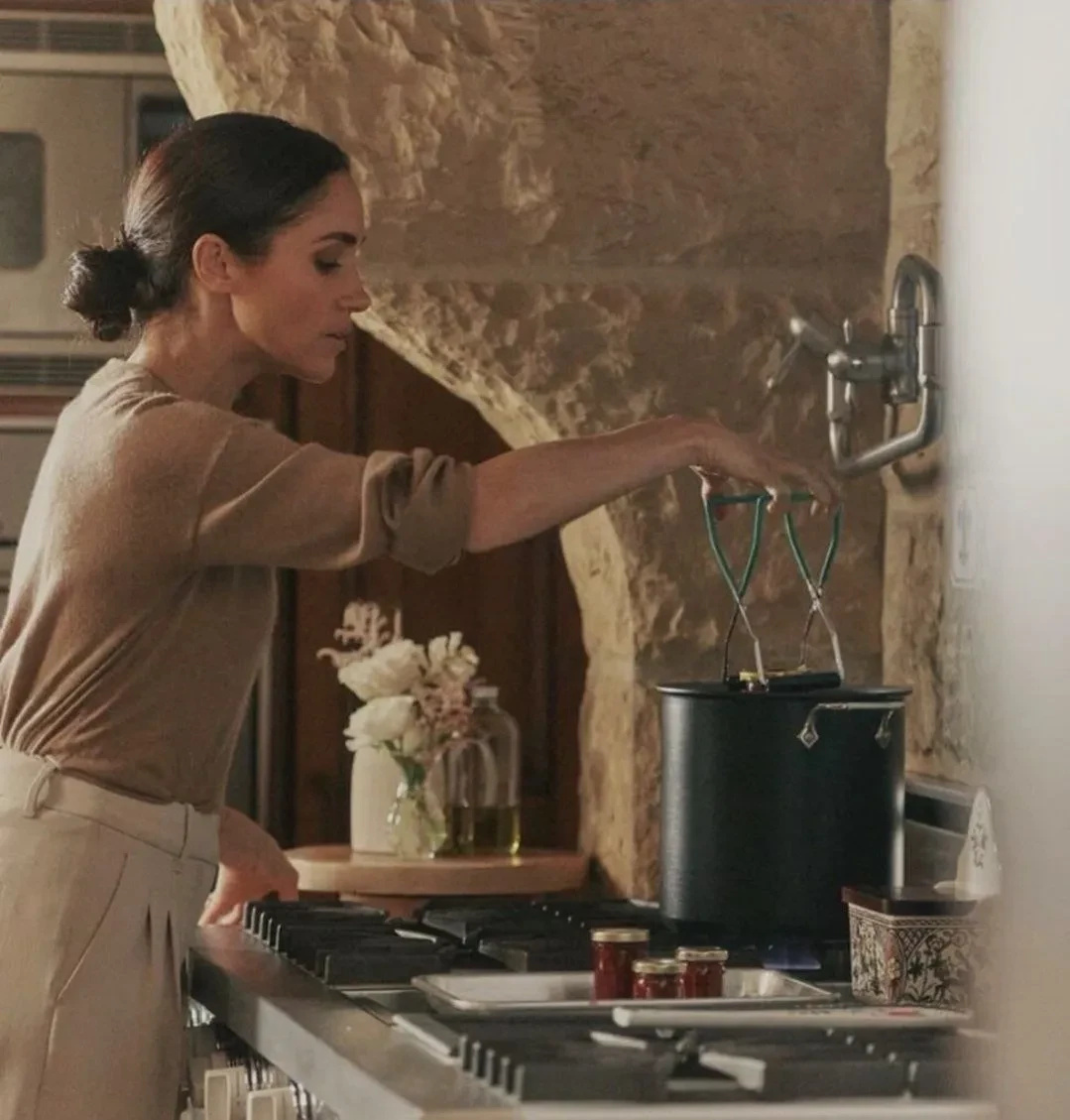 На фото Маркл позирует на своей кухне в Монтесито, используя оборудование для консервирования, чтобы вытащить банку с джемом из кастрюли на плите. "То, что началось с маленькой кастрюльки свежего фруктового варенья, тихо булькавшего на моей кухне, вдохновило меня на создание этой коллекции", — гласит подпись под публикацией.