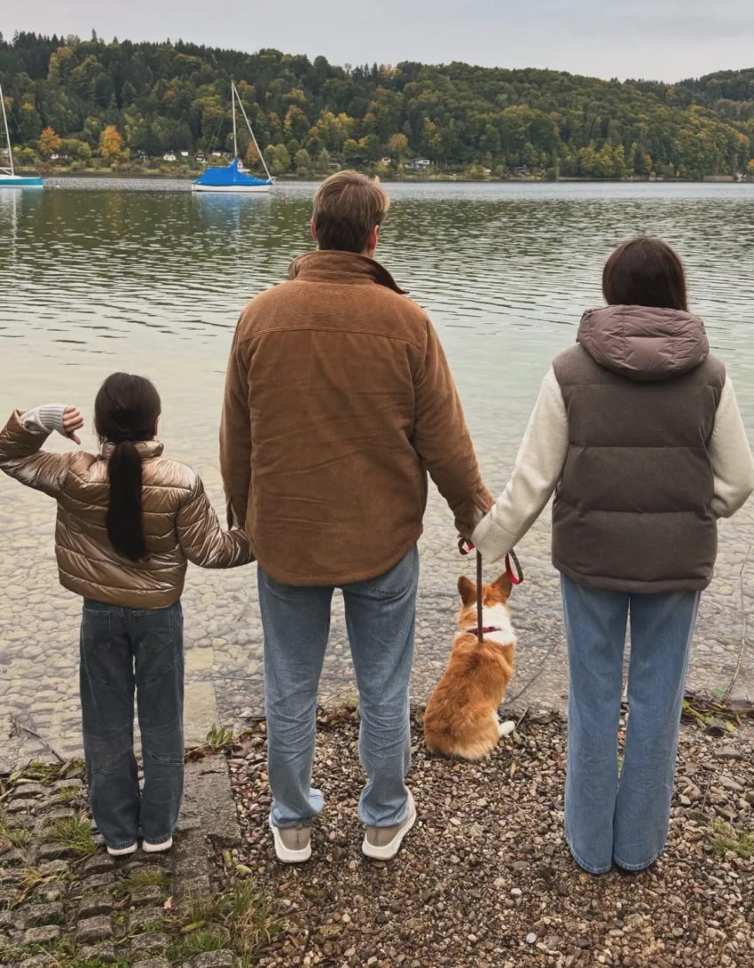 Семья вместе со своей собакой породы вельш-корги отправилась на загородный отдых. На редком семейном снимке они позируют со спины на берегу озера. Алексей дополнил фото известной песней Луи Армстронга What a Wonderful World.